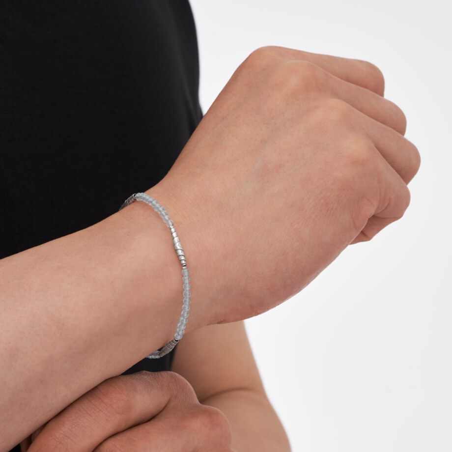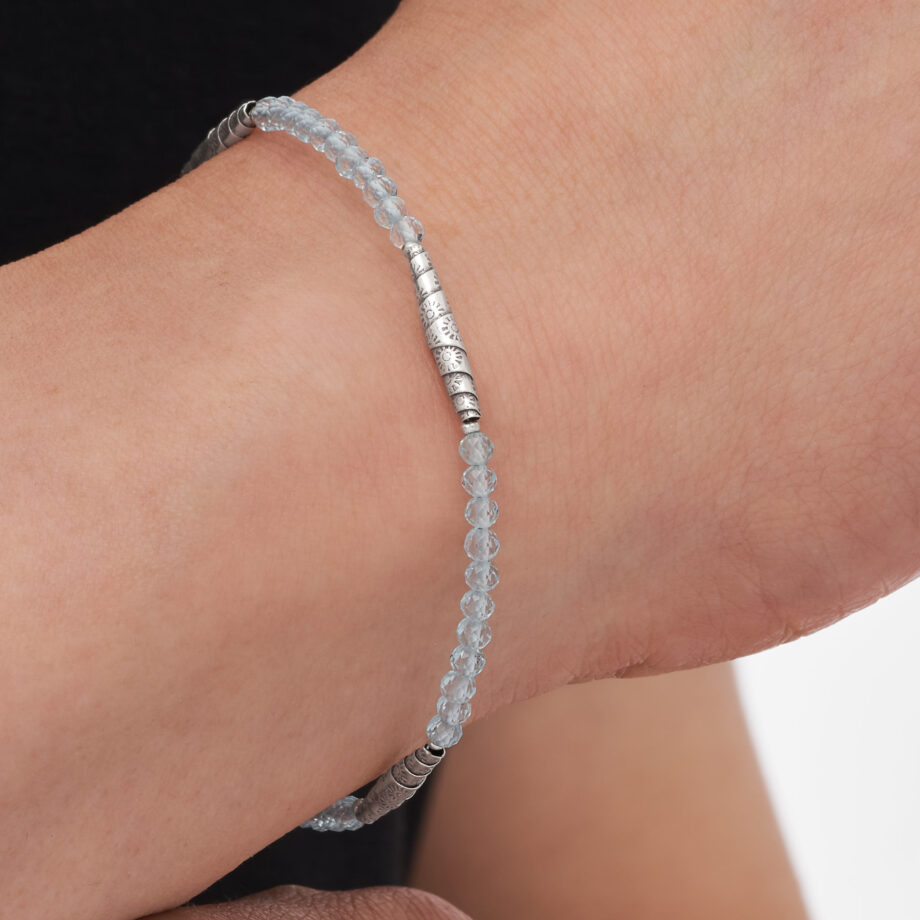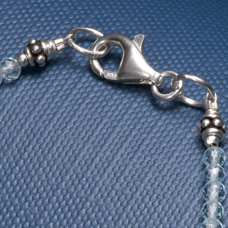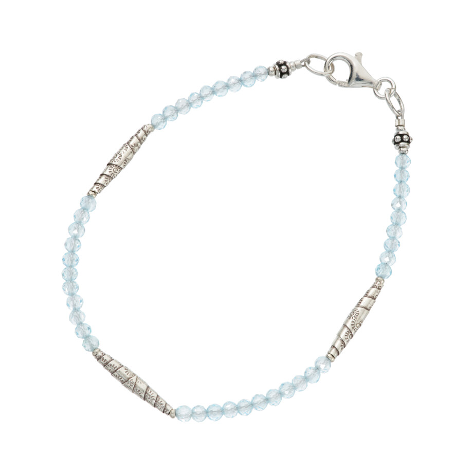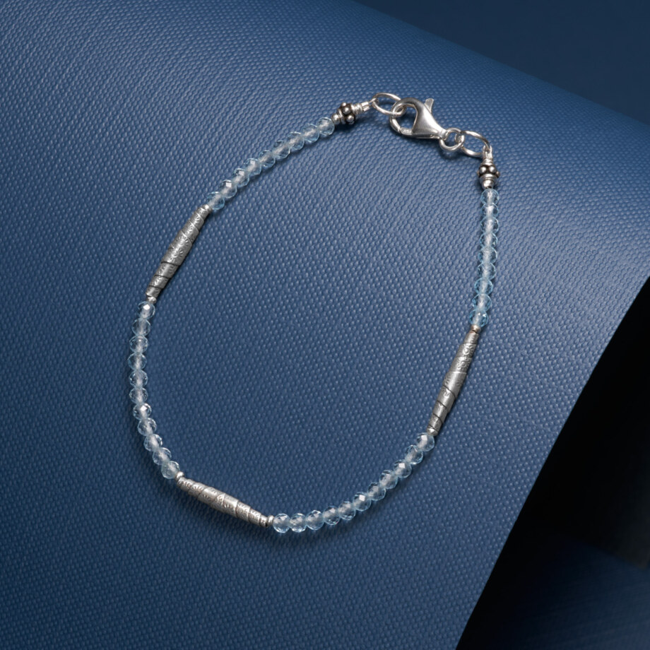 上質で透明度の高いブルートパーズを連ね、クロワッサン形のシルバービーズをバランスよく配置したブレスレットです。