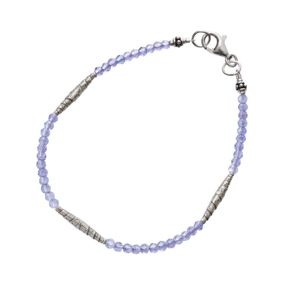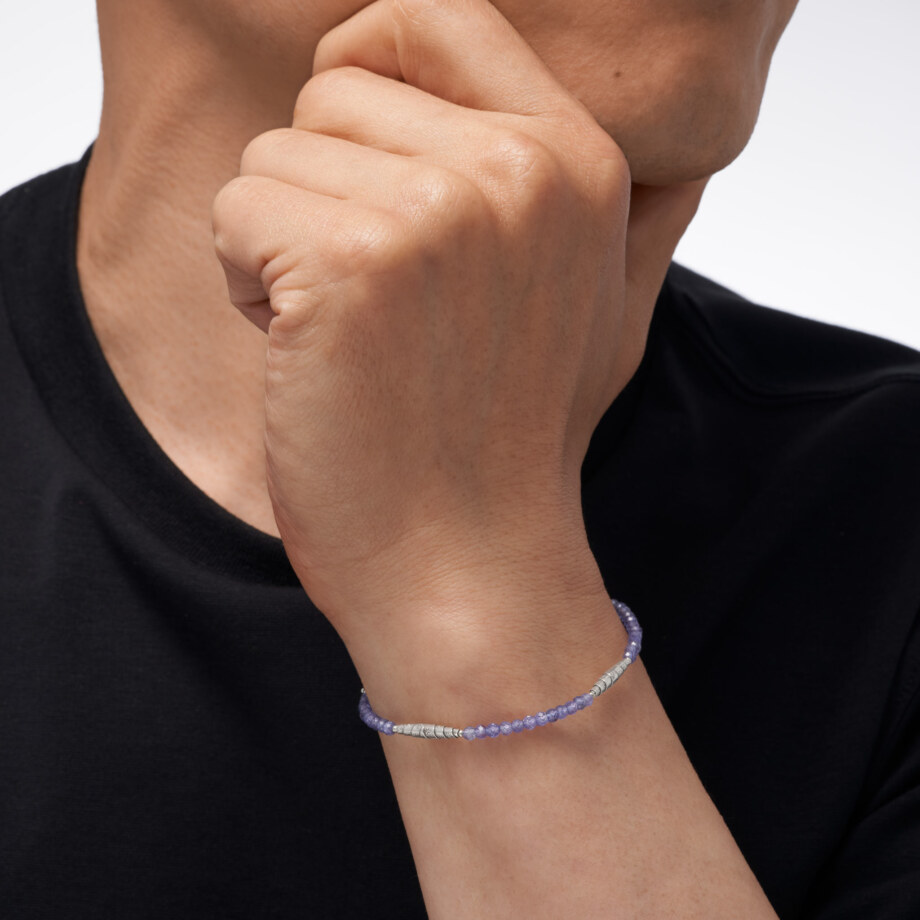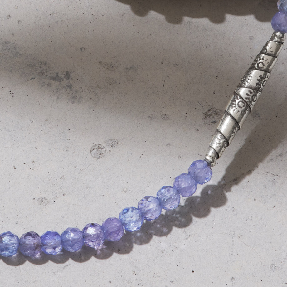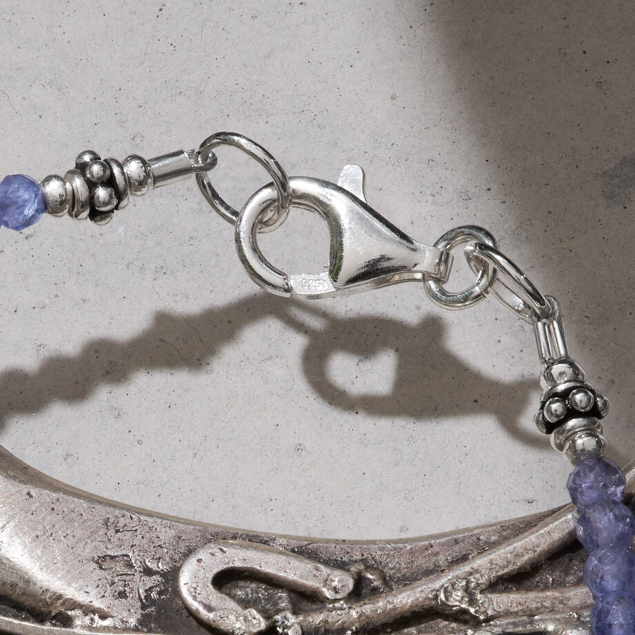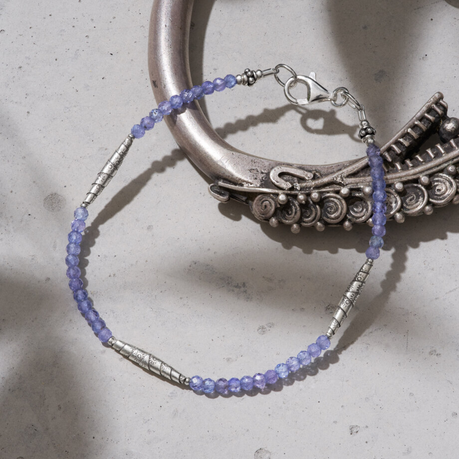 上質のタンザナイトビーズを連ね、間にクロワッサン形のカレンシルバーをあしらったブレスレットです。