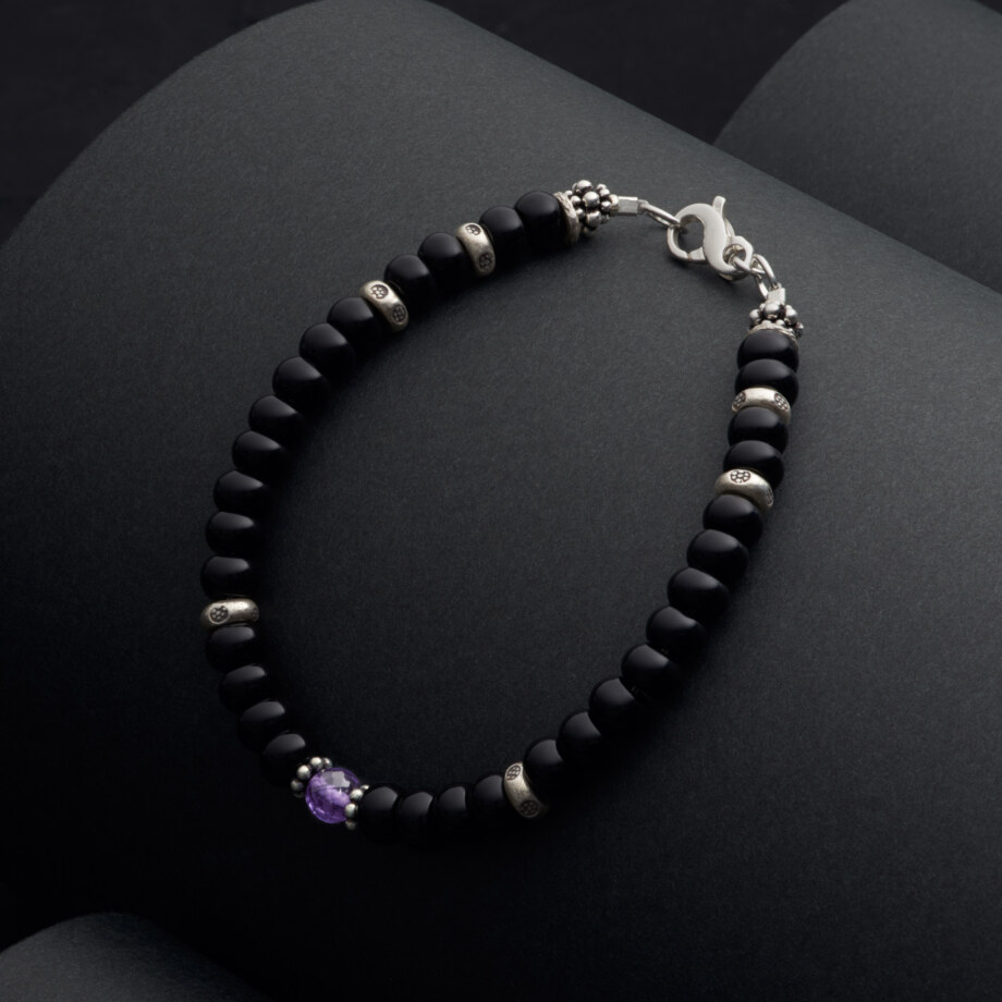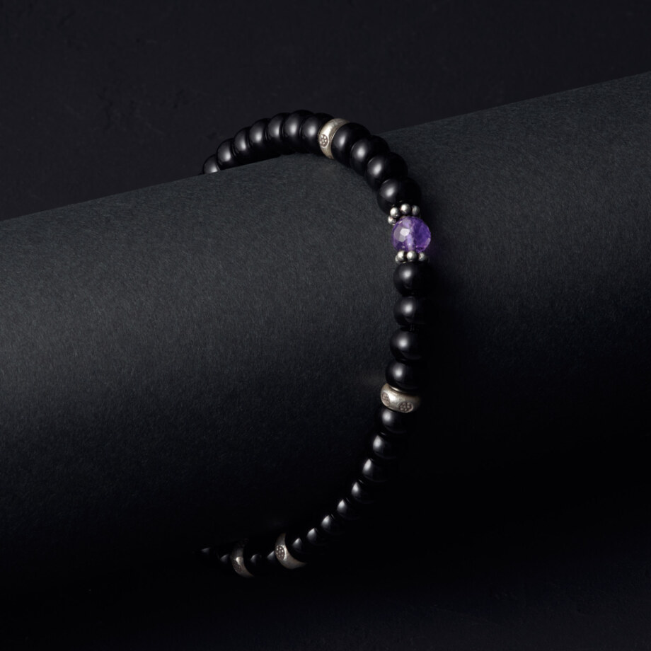 瑞々しい葡萄色のアメジストが、漆黒のブラックオニキスの狭間できらりと光るブレスレットです。