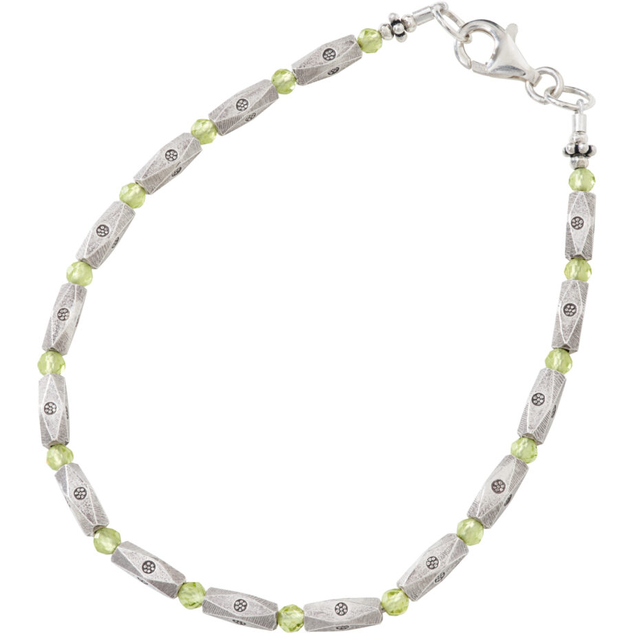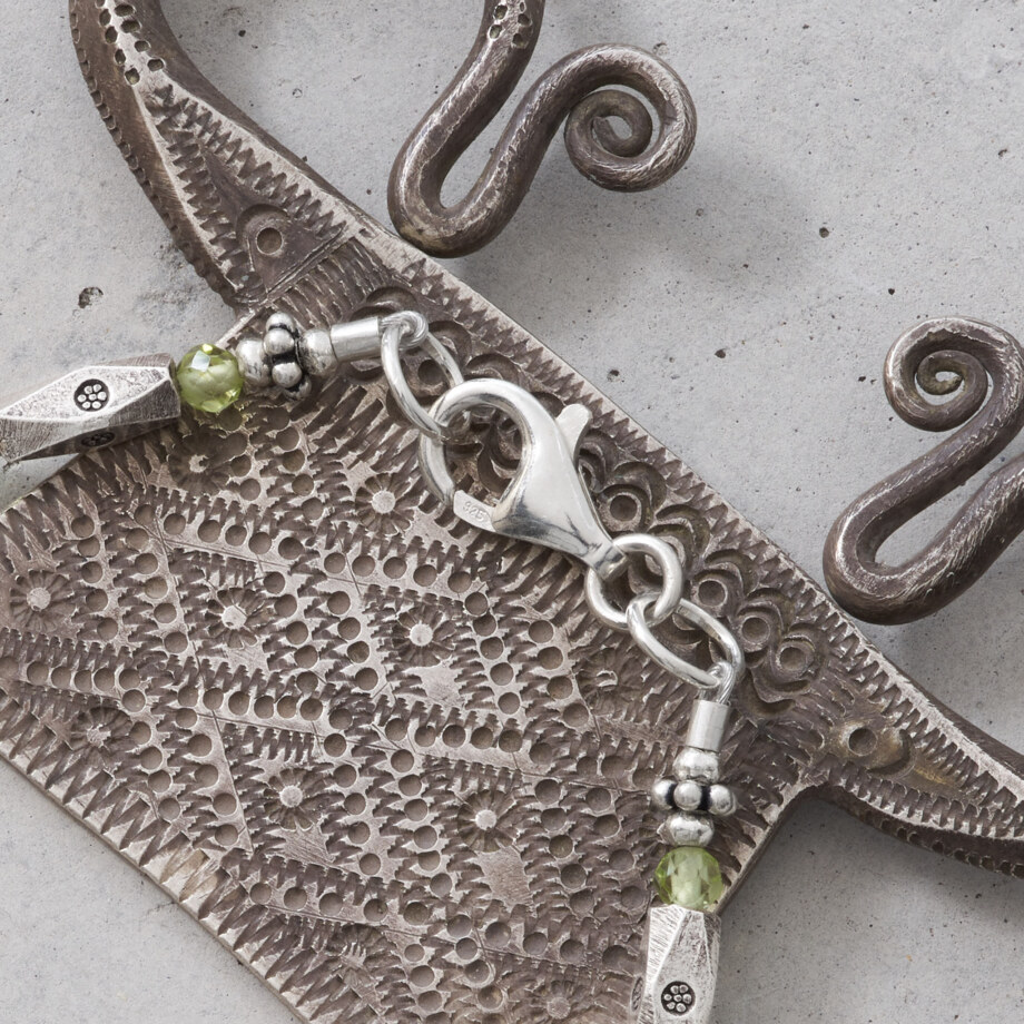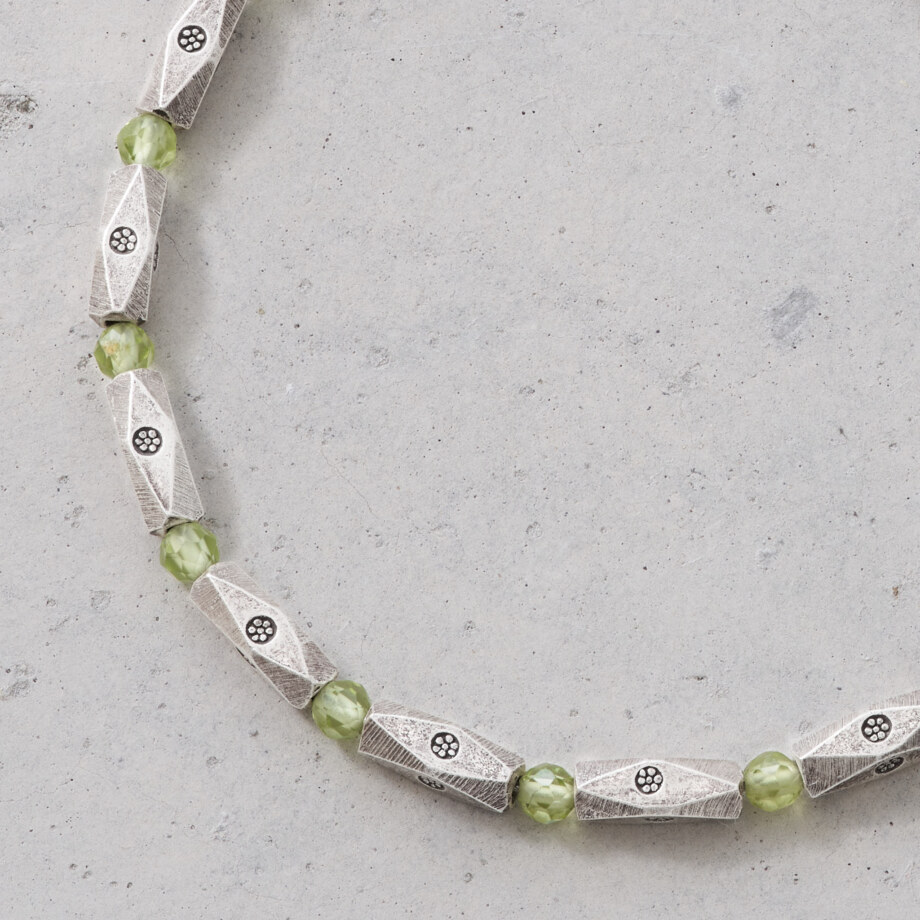 新緑の朝露のような瑞々しいペリドットと、直方体の角を削り落としたカレンシルバーが交互に繰り返すブレスレットです。
