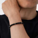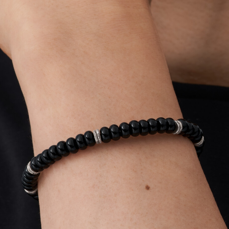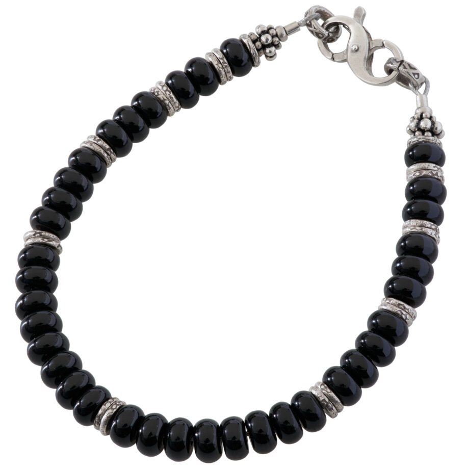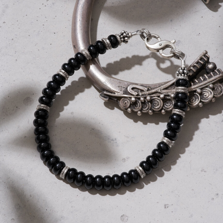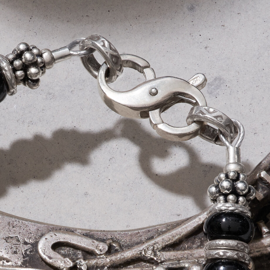 無限大のシンボルの形(∞)をした留め具と、刻印が打たれたカレンシルバーの円環が特色のブラックオニキスブレスレットです。