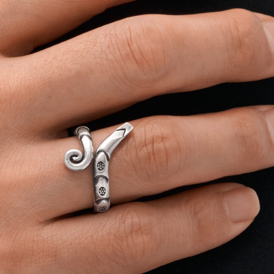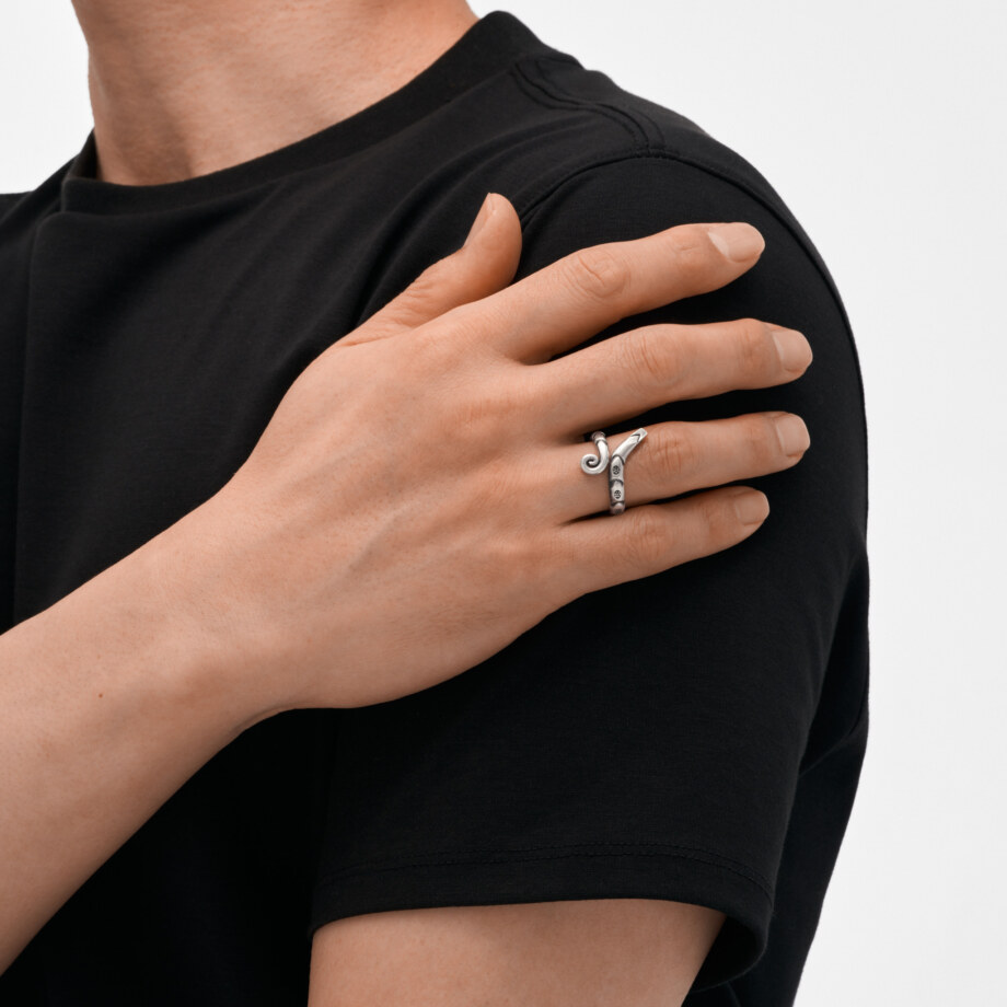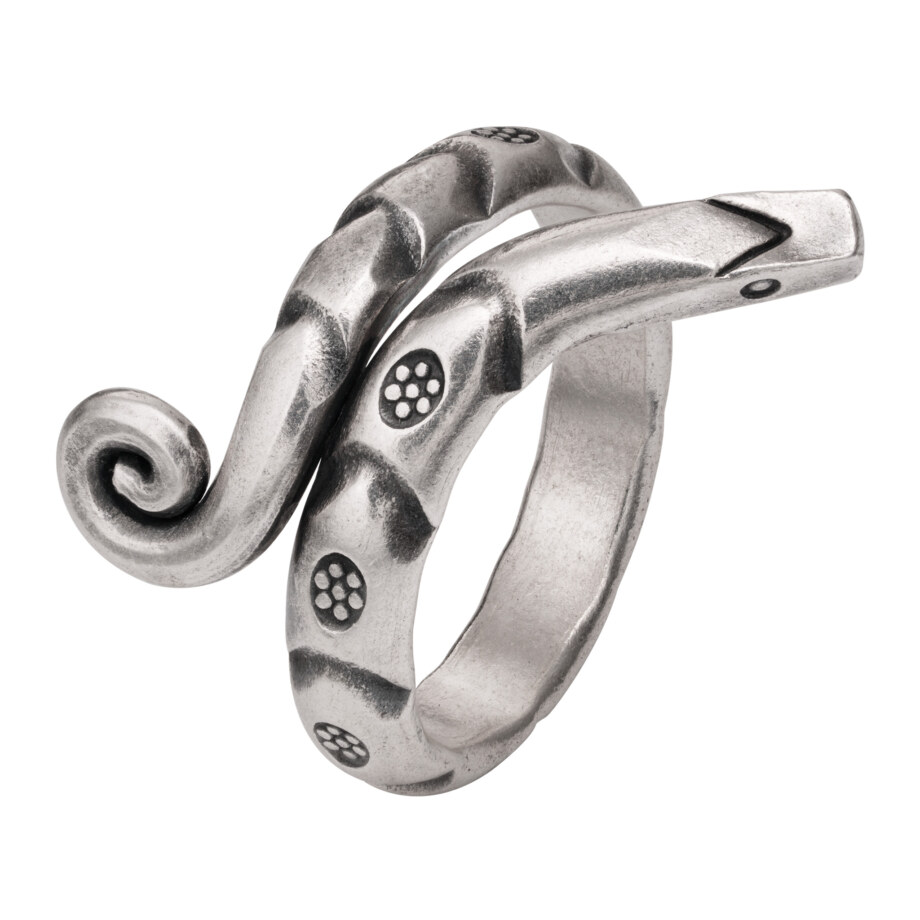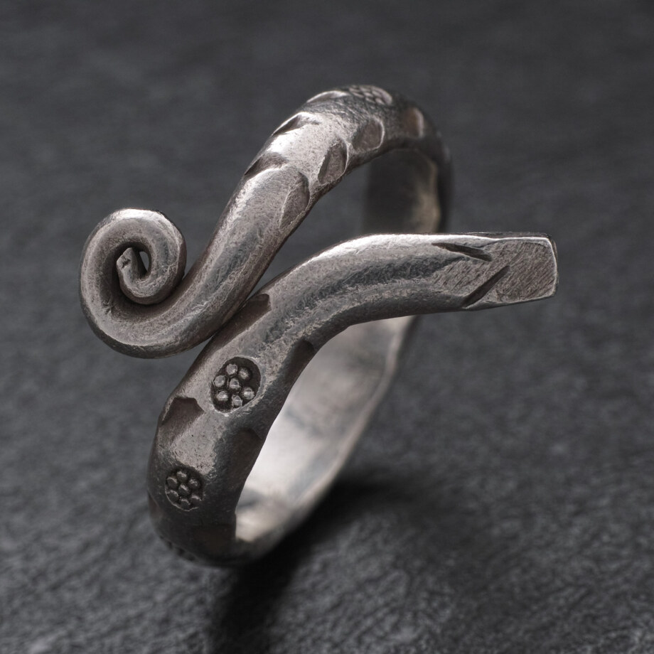 2重にとぐろを巻いた蛇をモチーフにした、甲丸のカレンシルバーリングです。