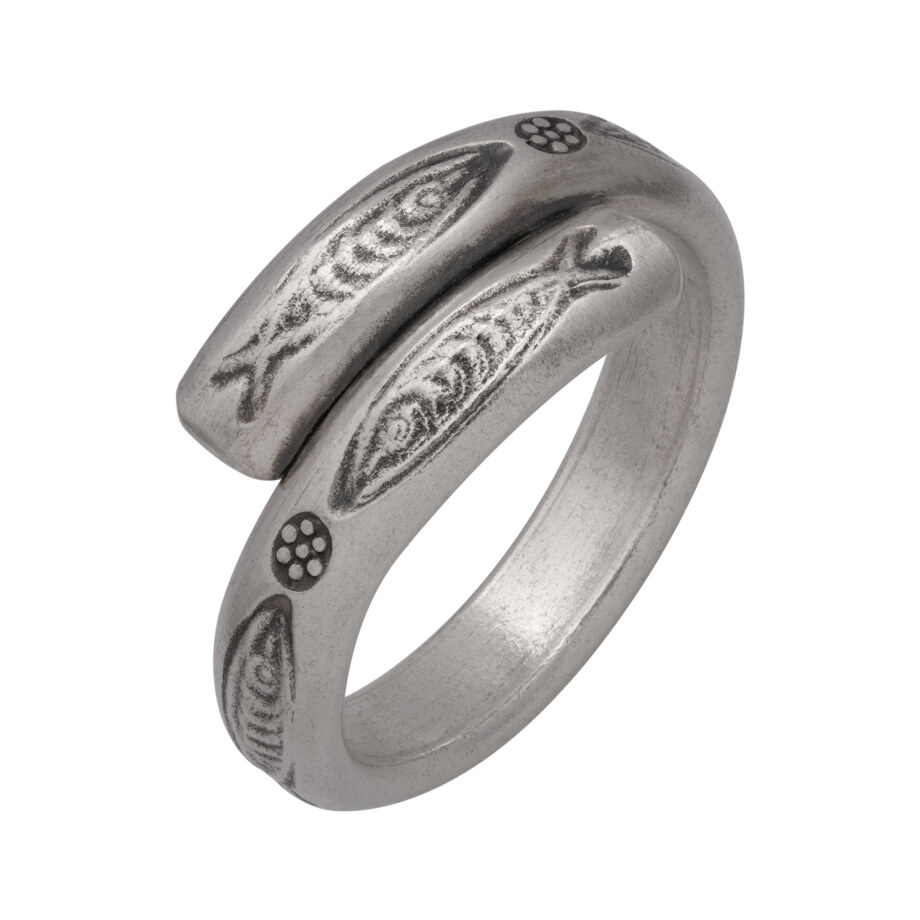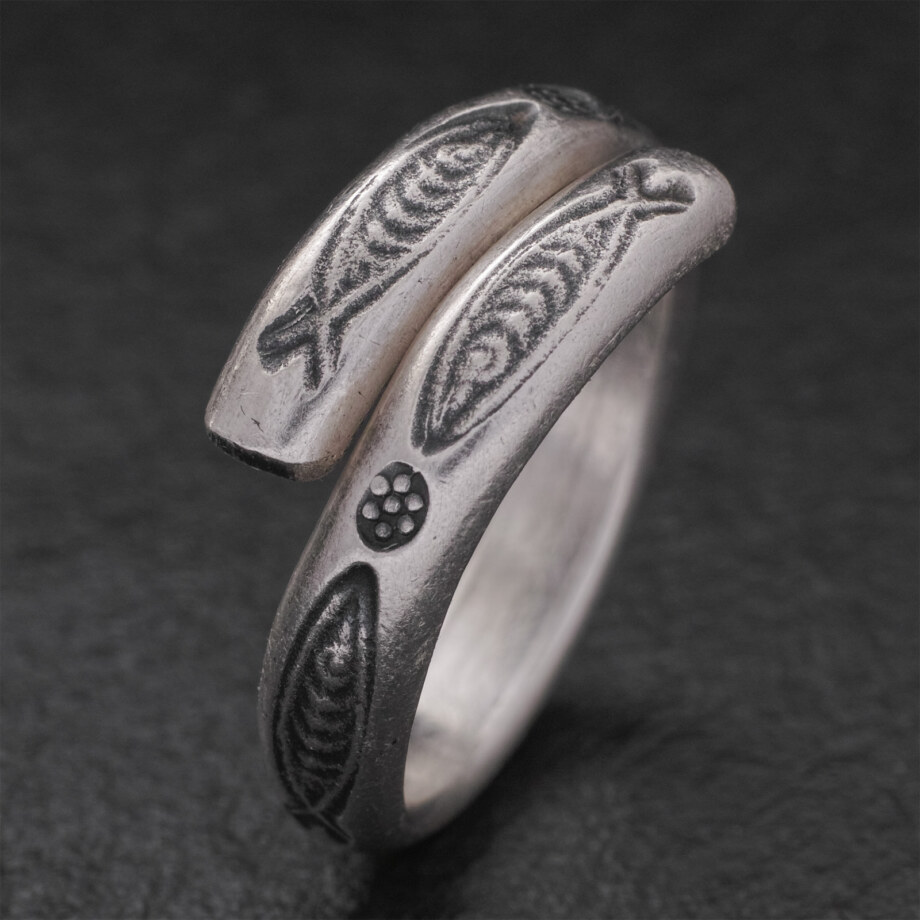 向き合う魚の刻印が打ち込まれた甲丸のカレンシルバーリングです。