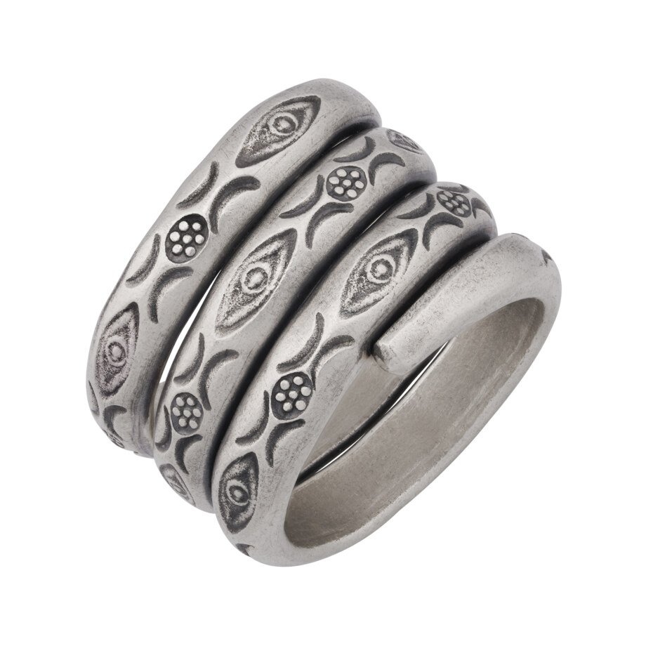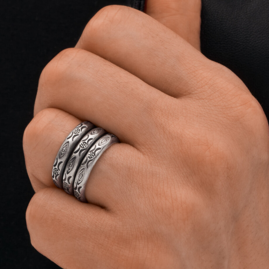 邪なものや災いを見張る護身符の「眼」が打ち込まれた甲丸のカレンシルバーリングです。