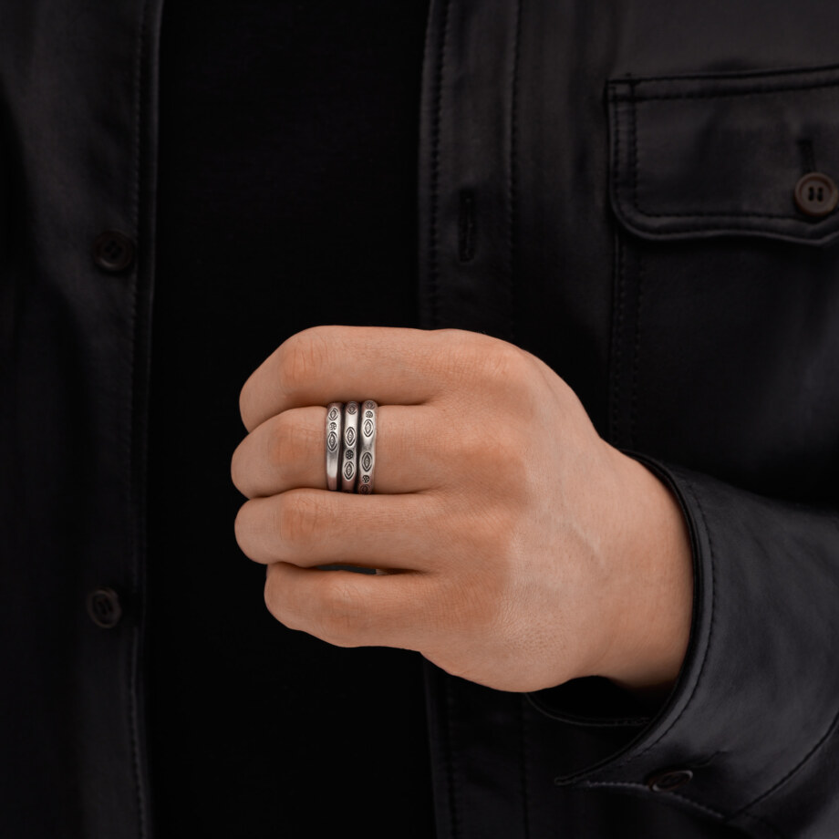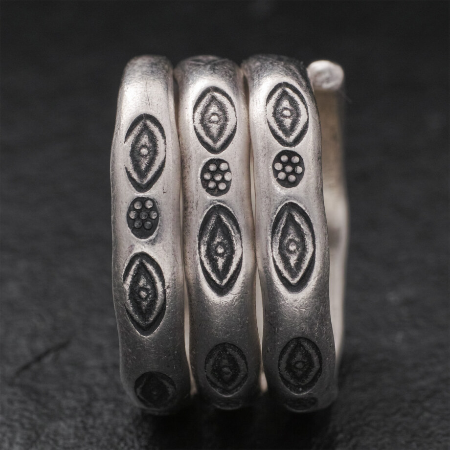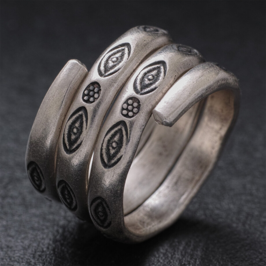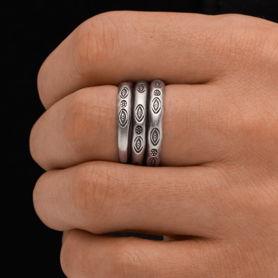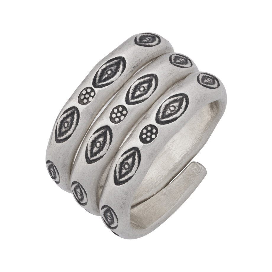 邪なものや災いを見張る護身符の「眼」が打ち込まれた甲丸のカレンシルバーリングです。