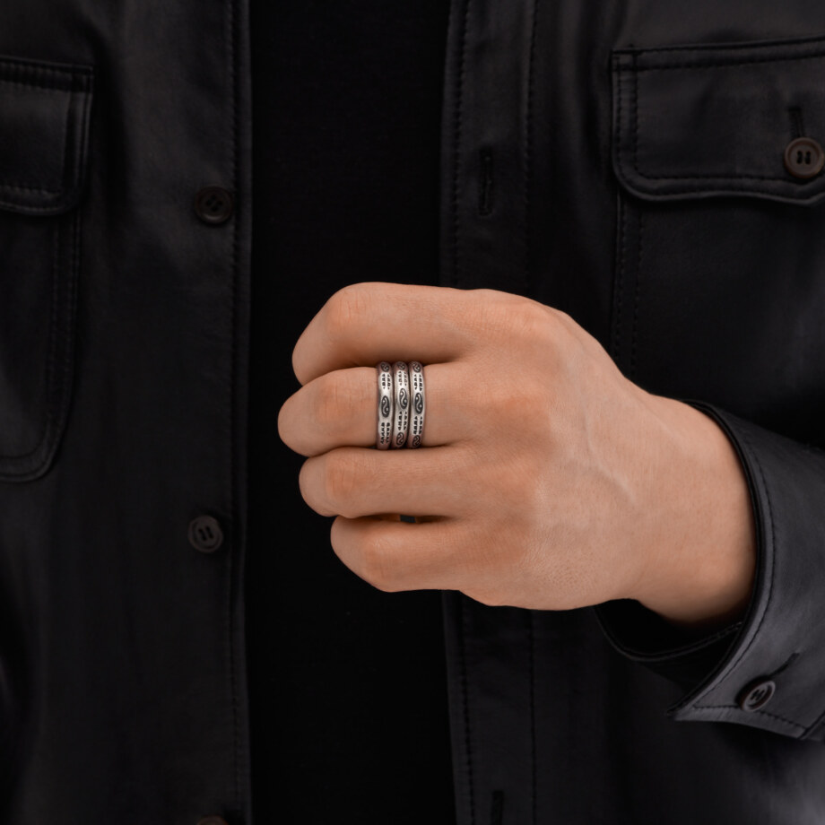 「陰陽」と「芋虫」の刻印を交互にあしらった細身で甲丸のカレンシルバーリングです。