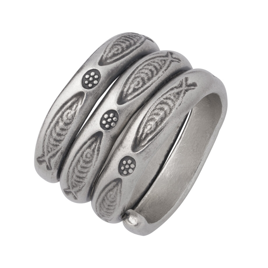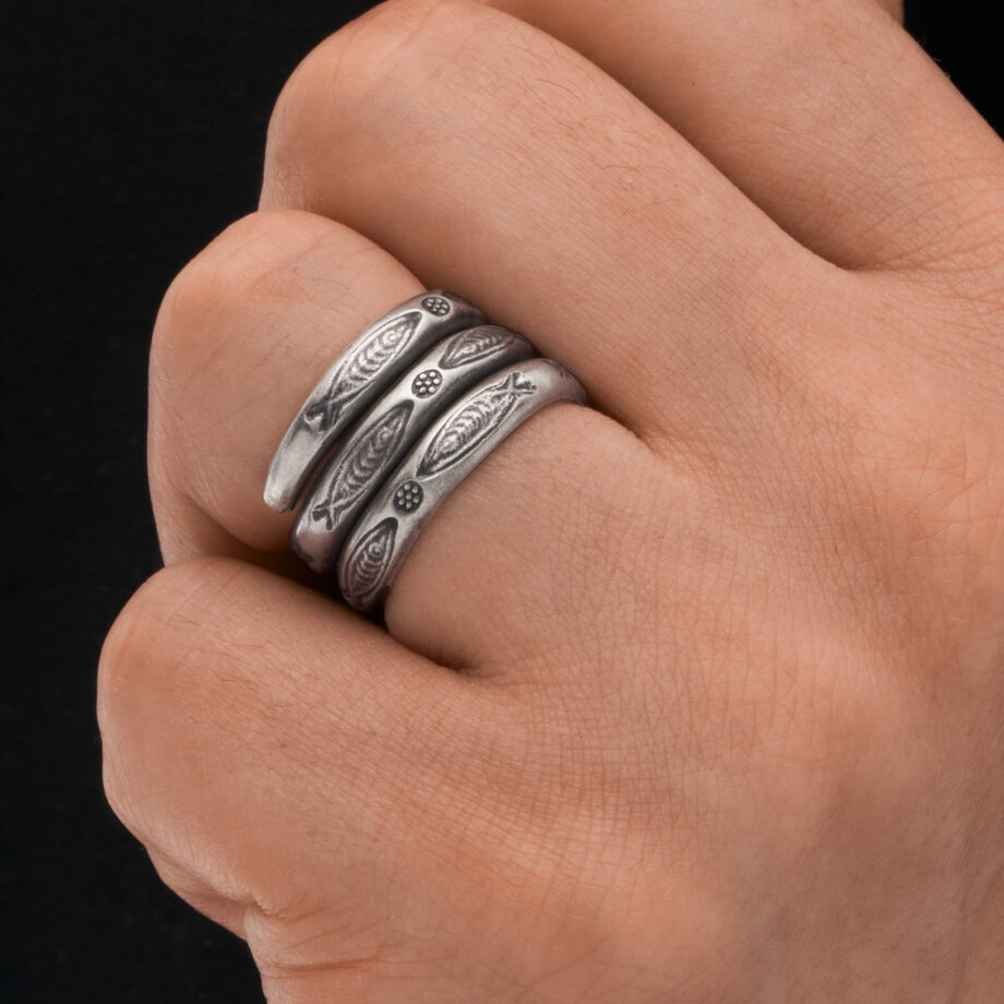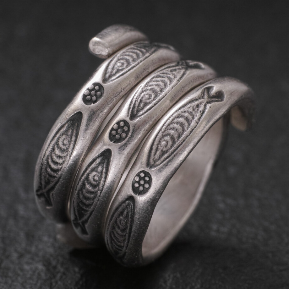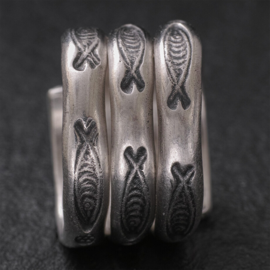 向き合う魚の刻印が打ち込まれた甲丸のカレンシルバーリングです。