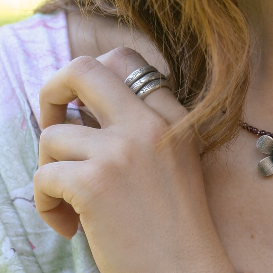 メンズ/レディース兼用。フリーサイズ。純度の高い銀を使用しているので柔らかく、サイズを自由に変えられるのが特長です。