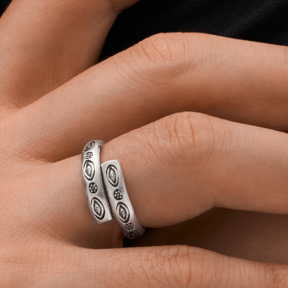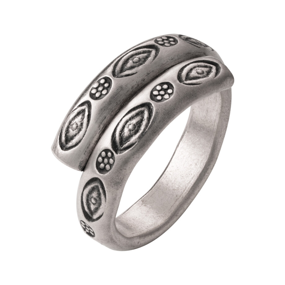 邪なものや災いを見張る護身符の「眼」が打ち込まれた甲丸のカレンシルバーリングです。