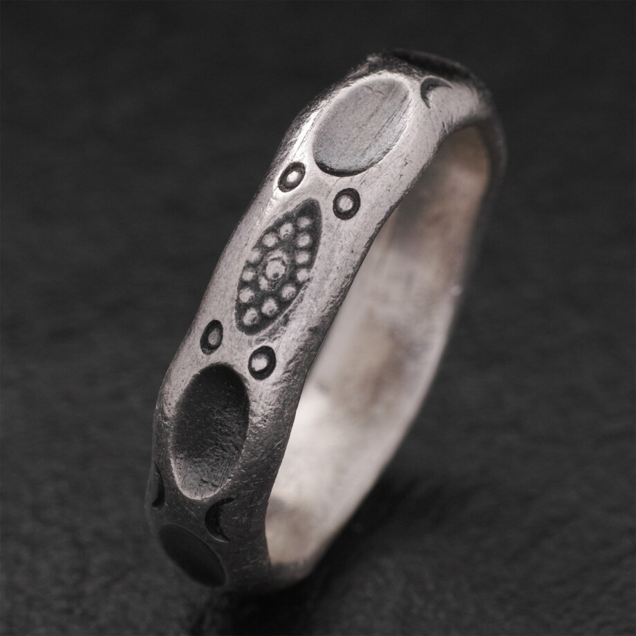 邪なものや災いを見張る護身符の「眼」が打ち込まれた甲丸のカレンシルバーリングです。