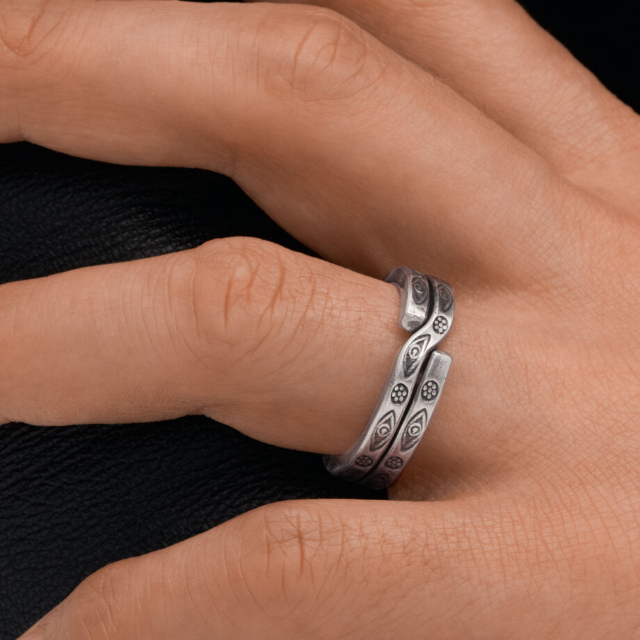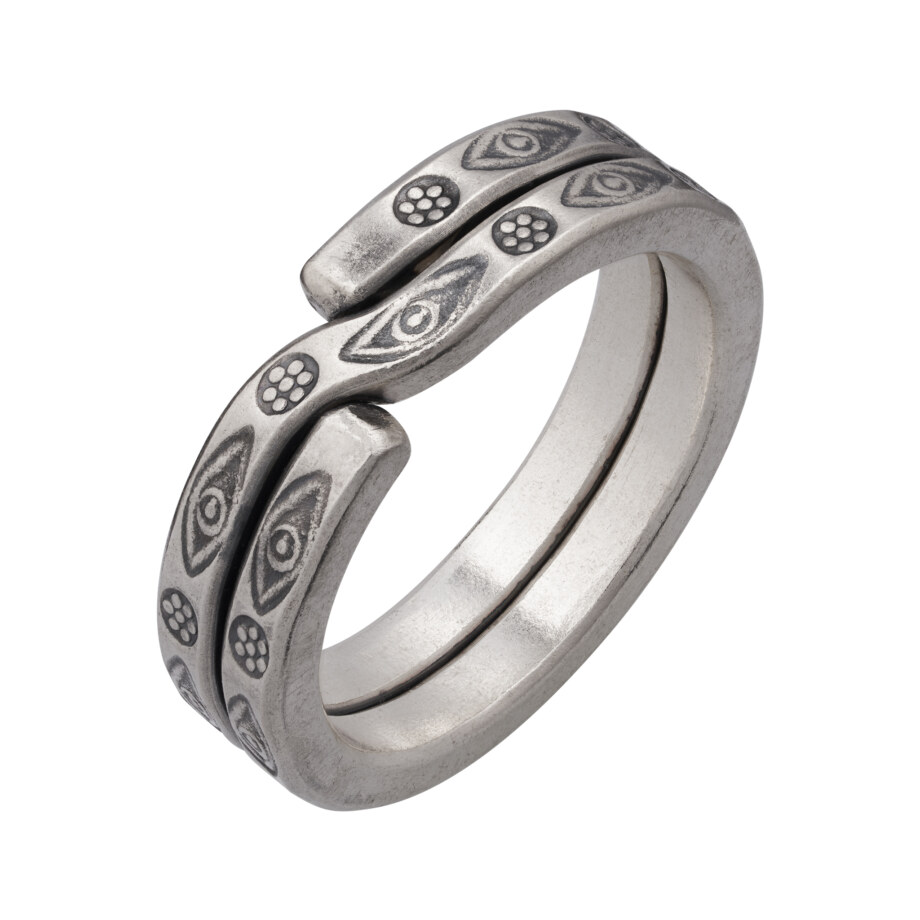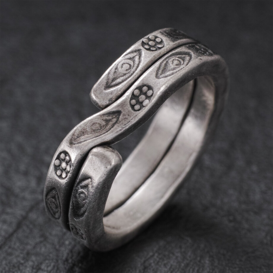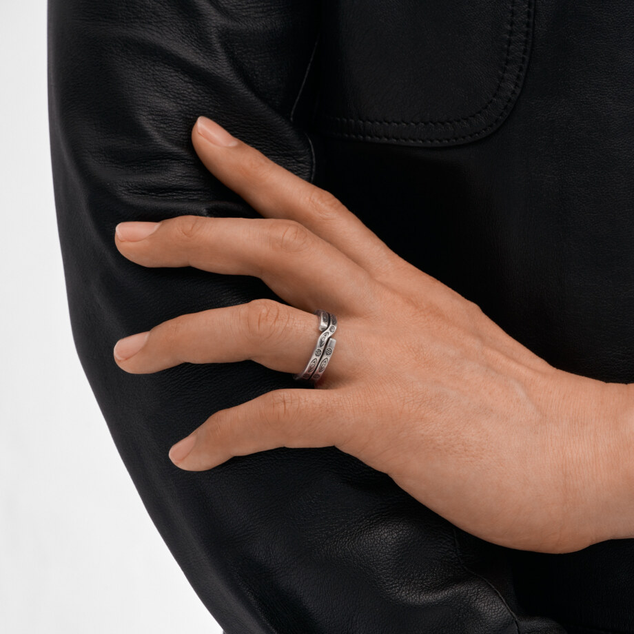 始まりと終わりが互いに向き合い、螺旋でありながら円環でもある平打ちのカレンシルバーリングです。