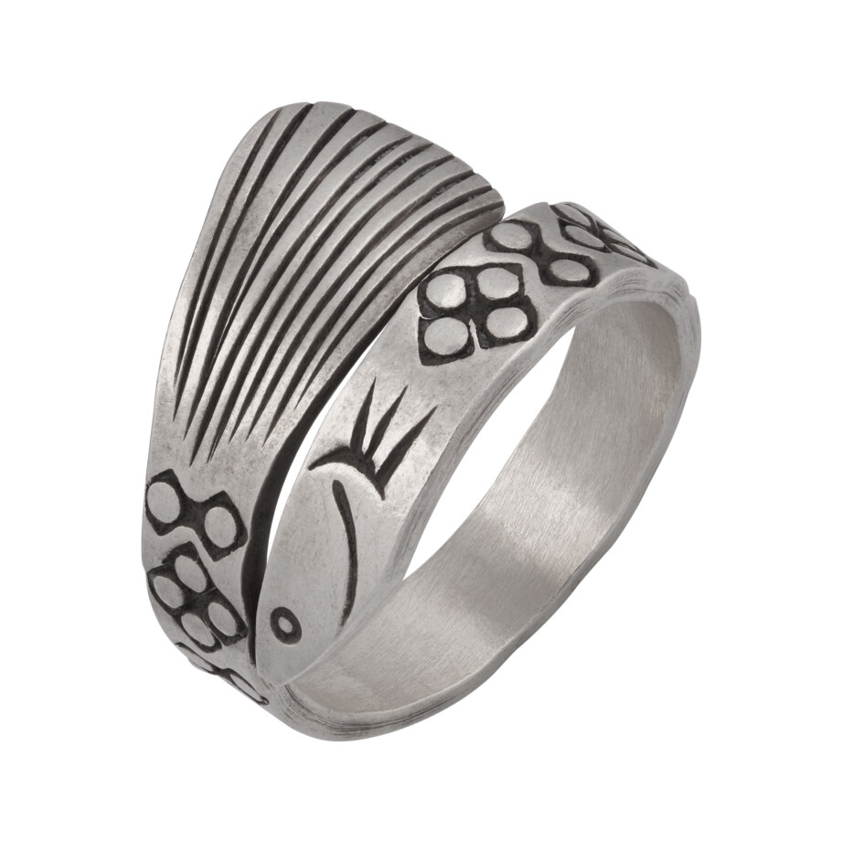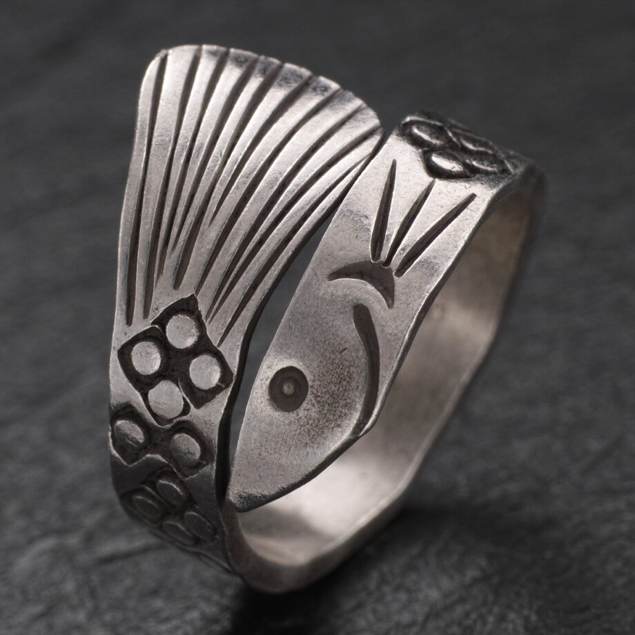 頭から尾びれまで魚一匹丸ごとリングにした平打ちのカレンシルバーリングです。