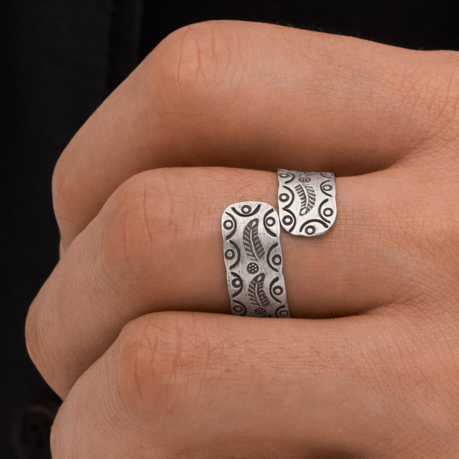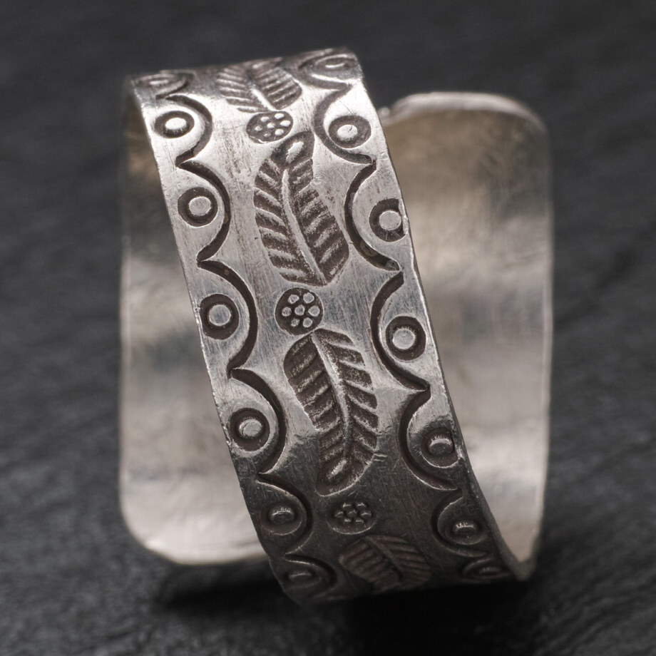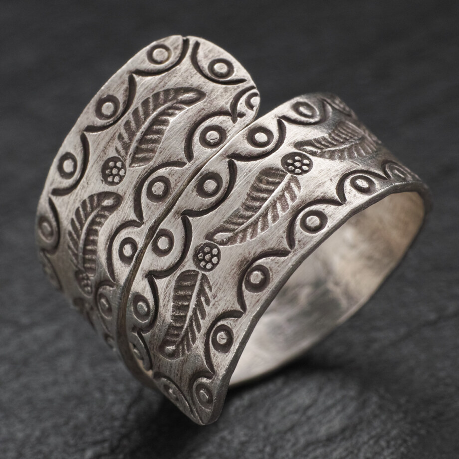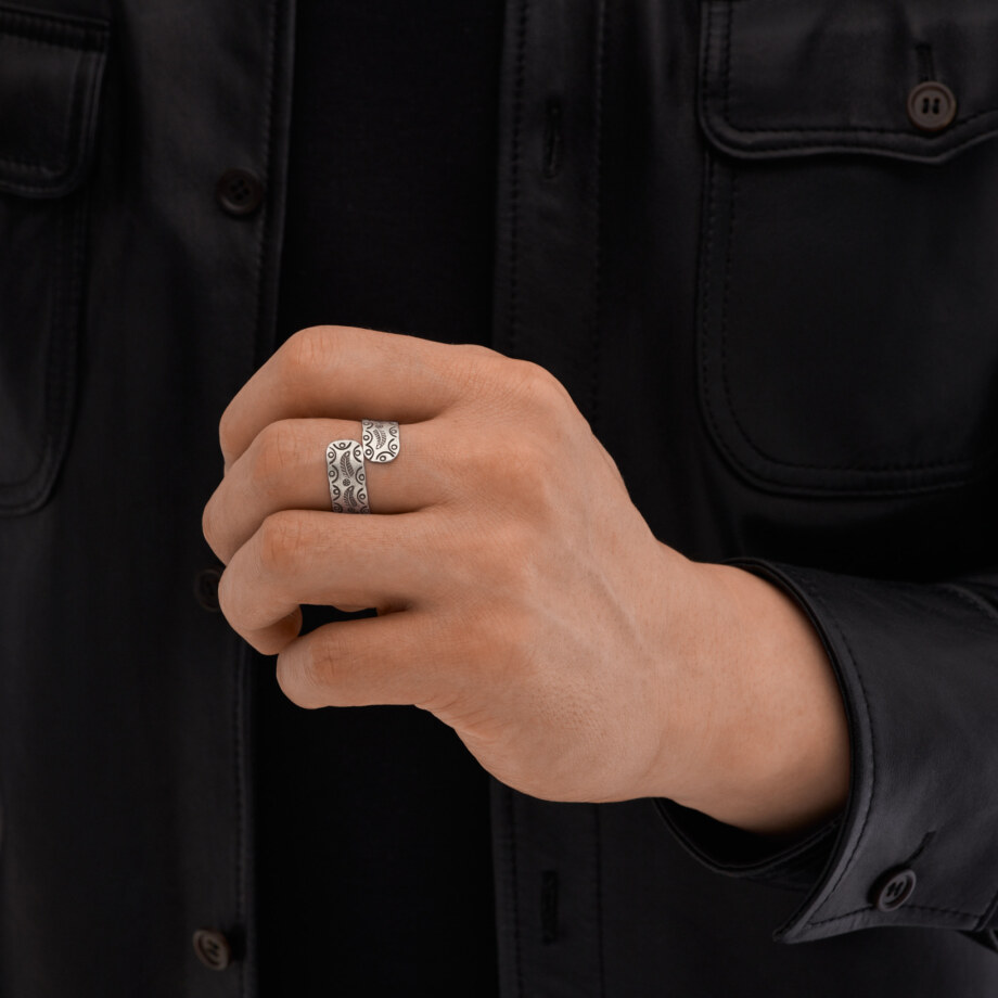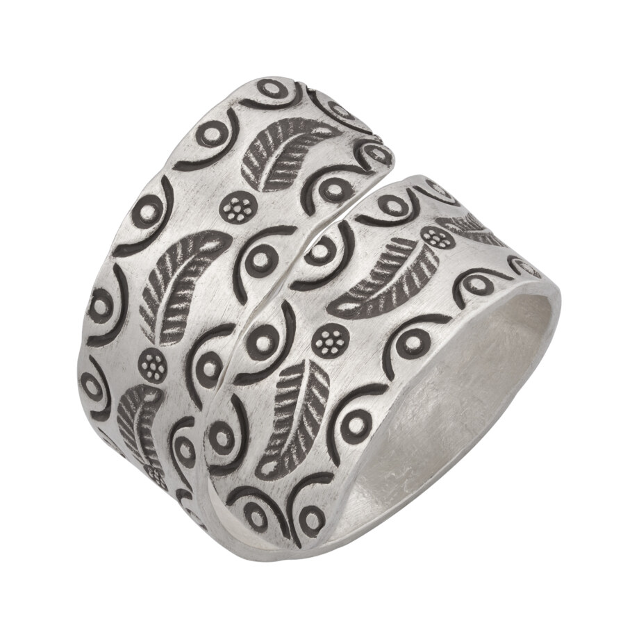 羽根の文様が端から端まで一面ぐるりと取り囲む、平打ちのカレンシルバーリングです。