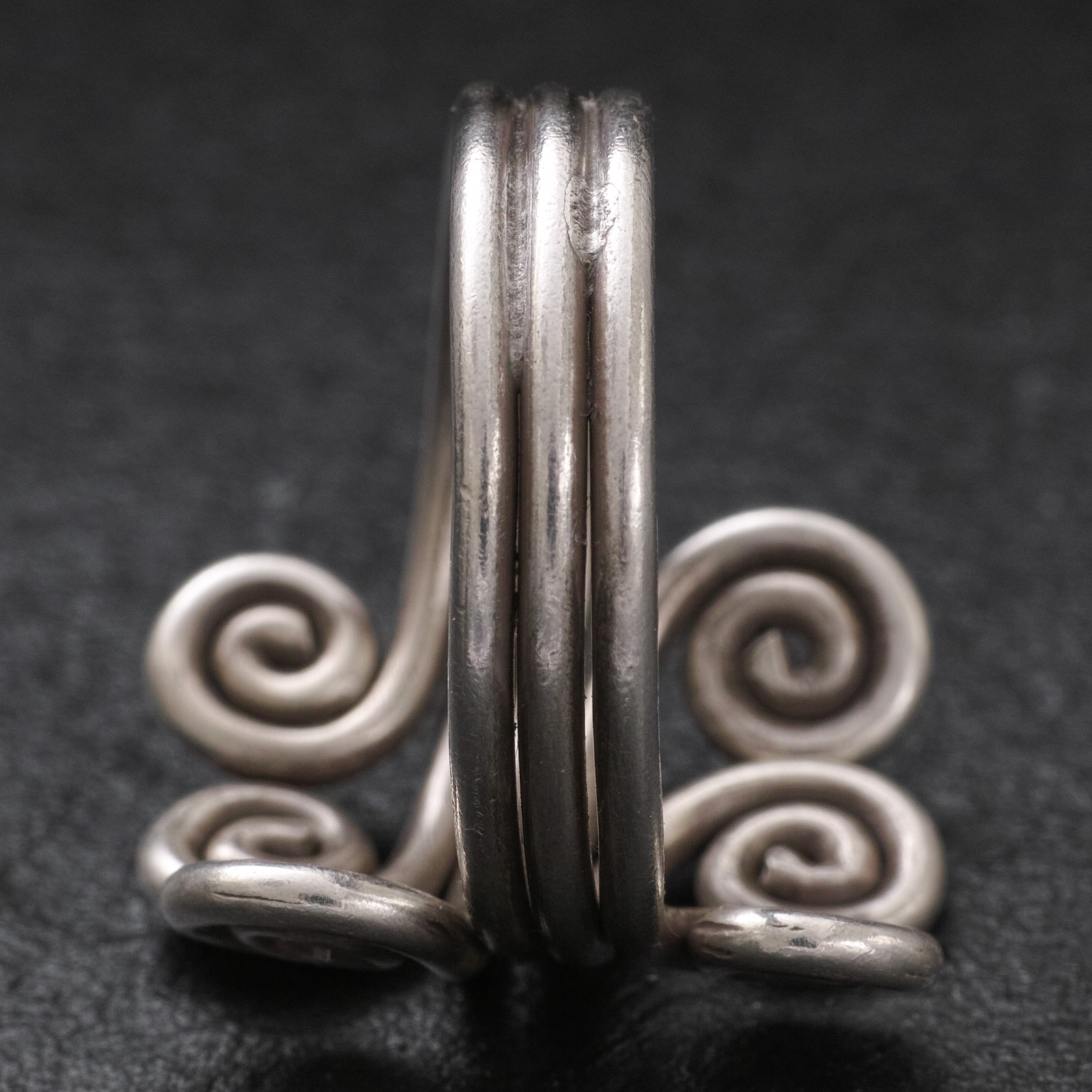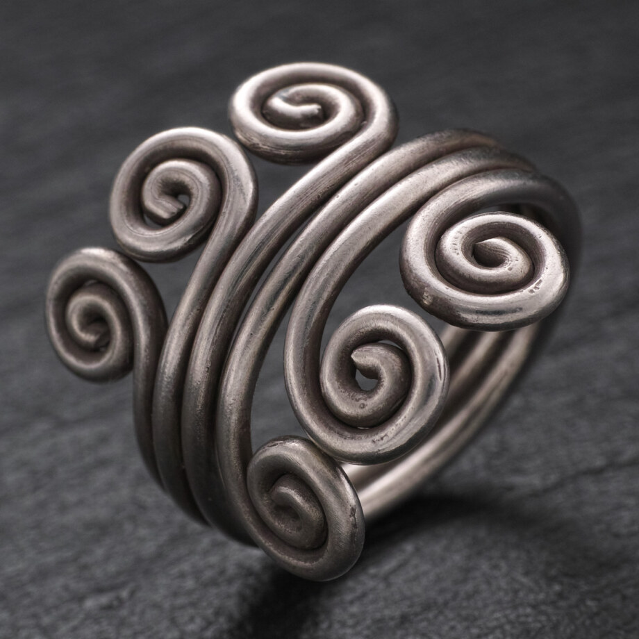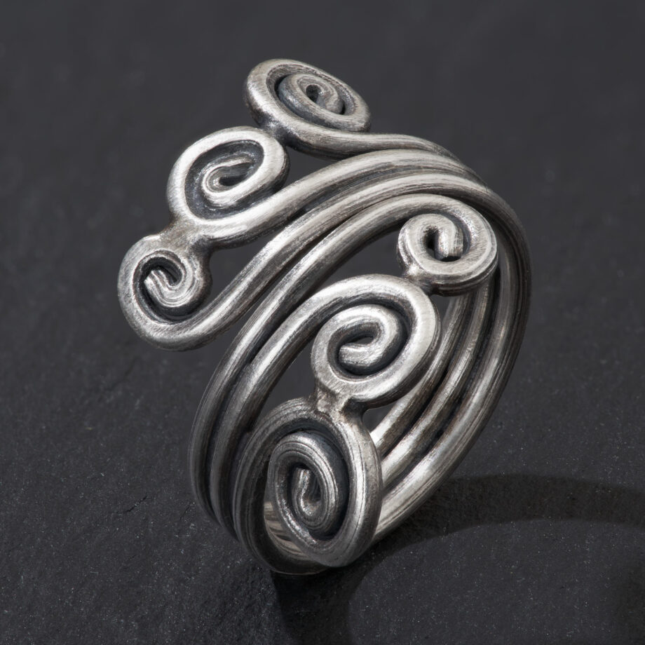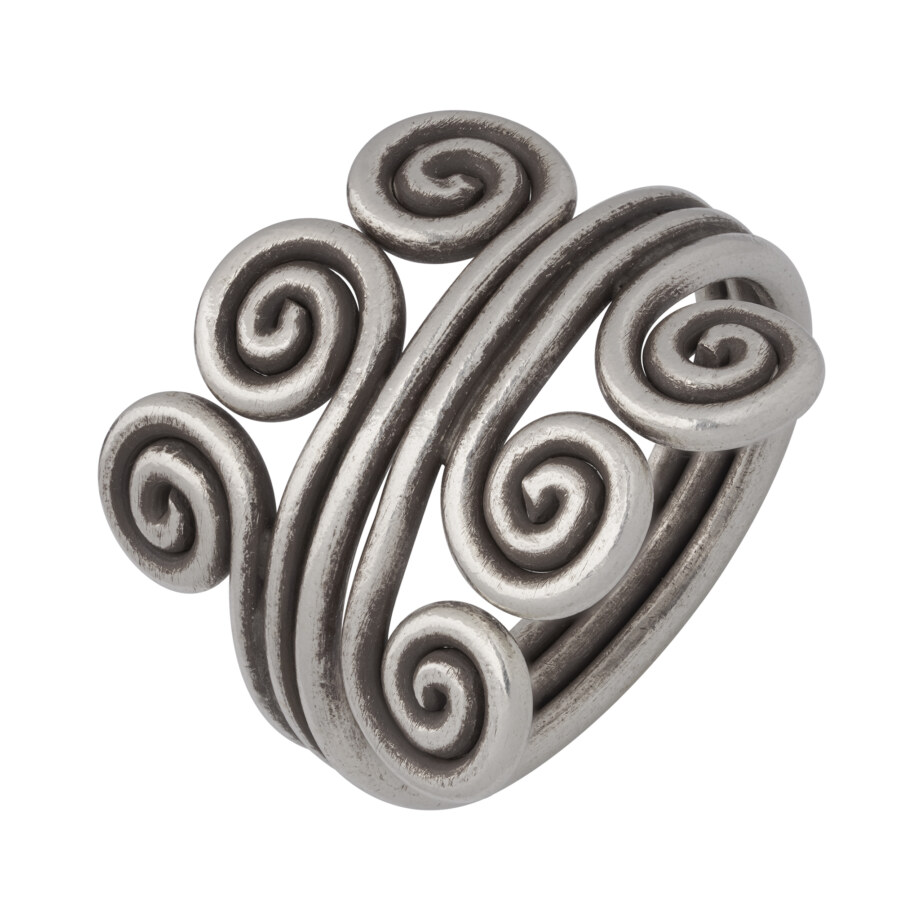 波紋のような渦巻きが指元を涼やかに包むカレンシルバーリングです。