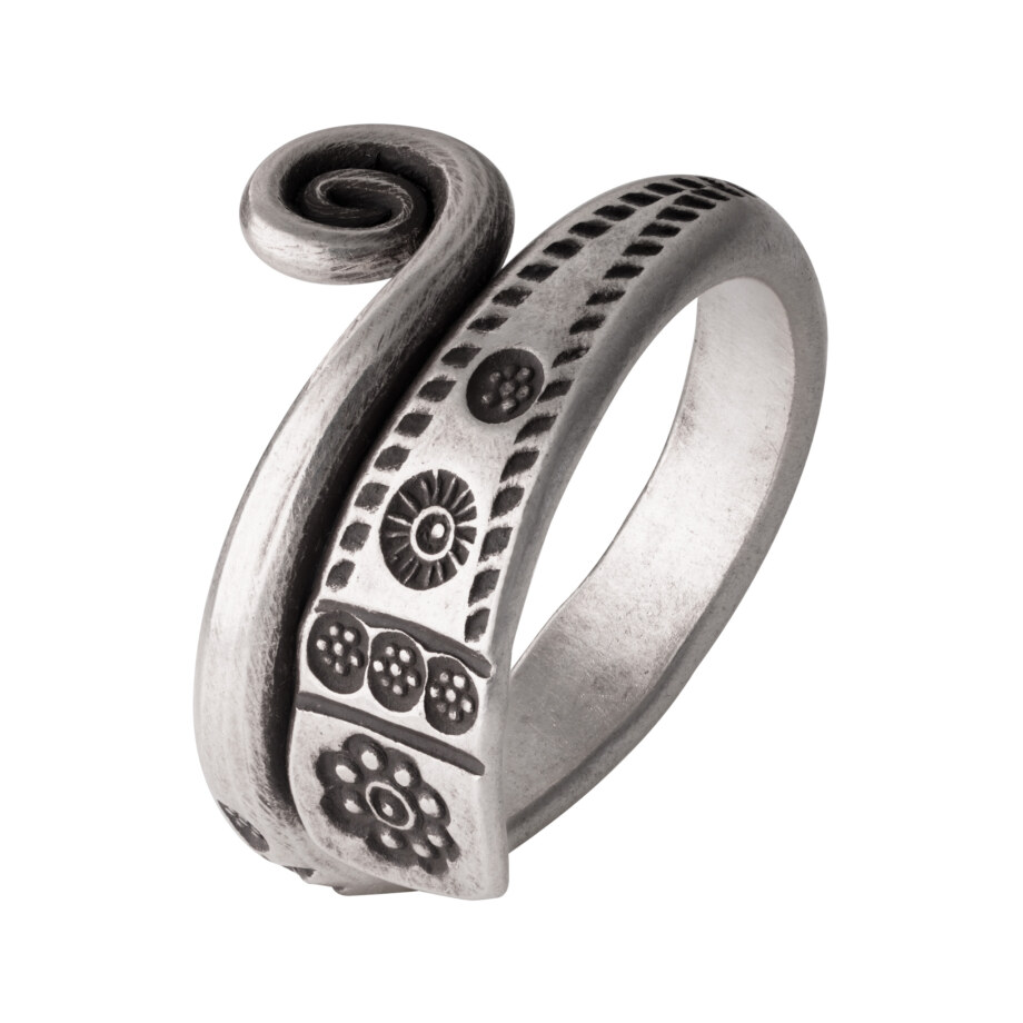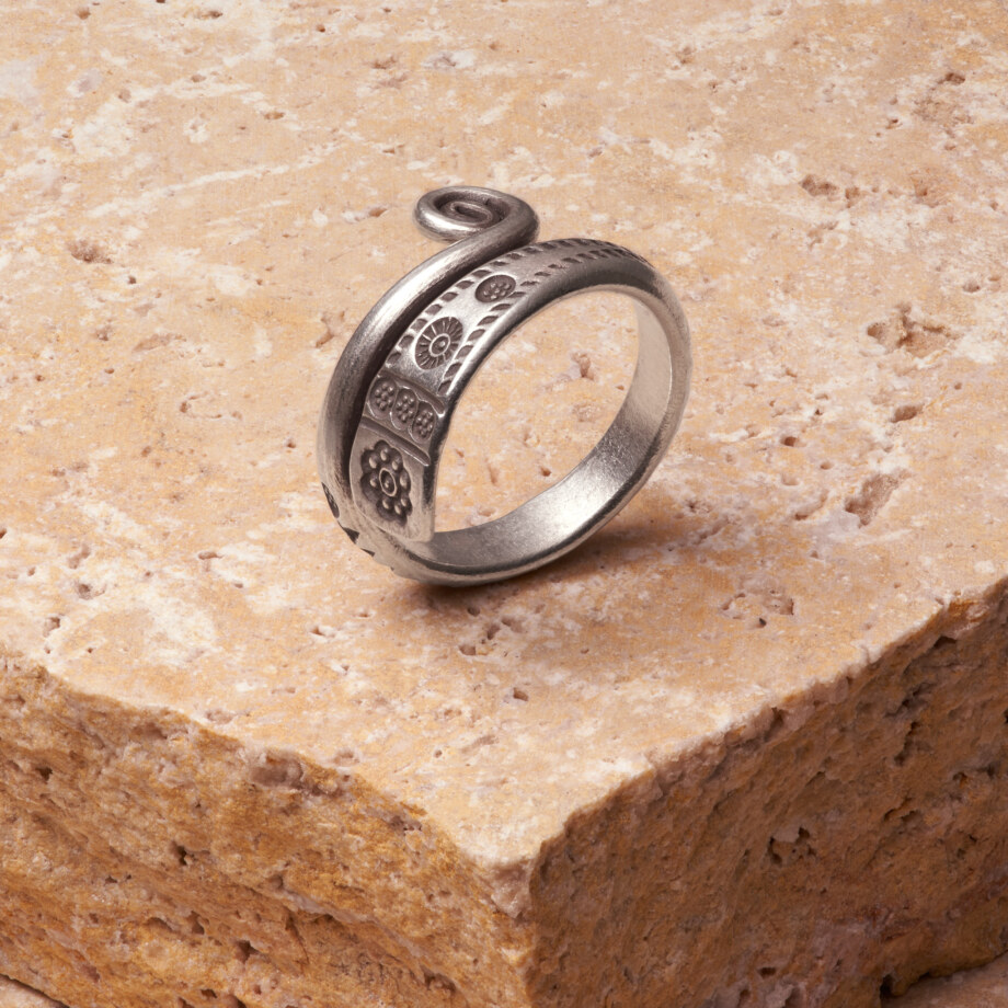 一方に巧みに打たれた刻印が広がり、もう一方は渦状に巻かれたユニークなフォルムのカレンシルバーリングです。