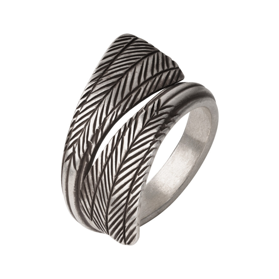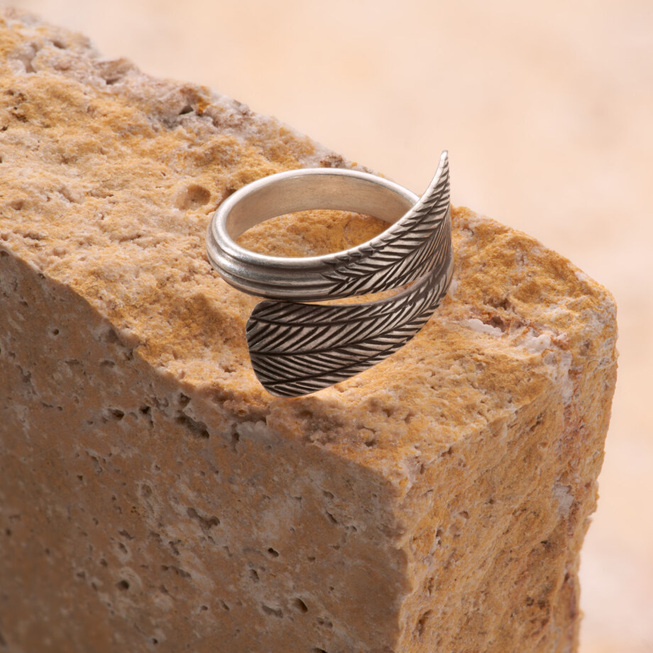 平らにならした両端に羽根の文様が広がる甲丸のカレンシルバーリングです。