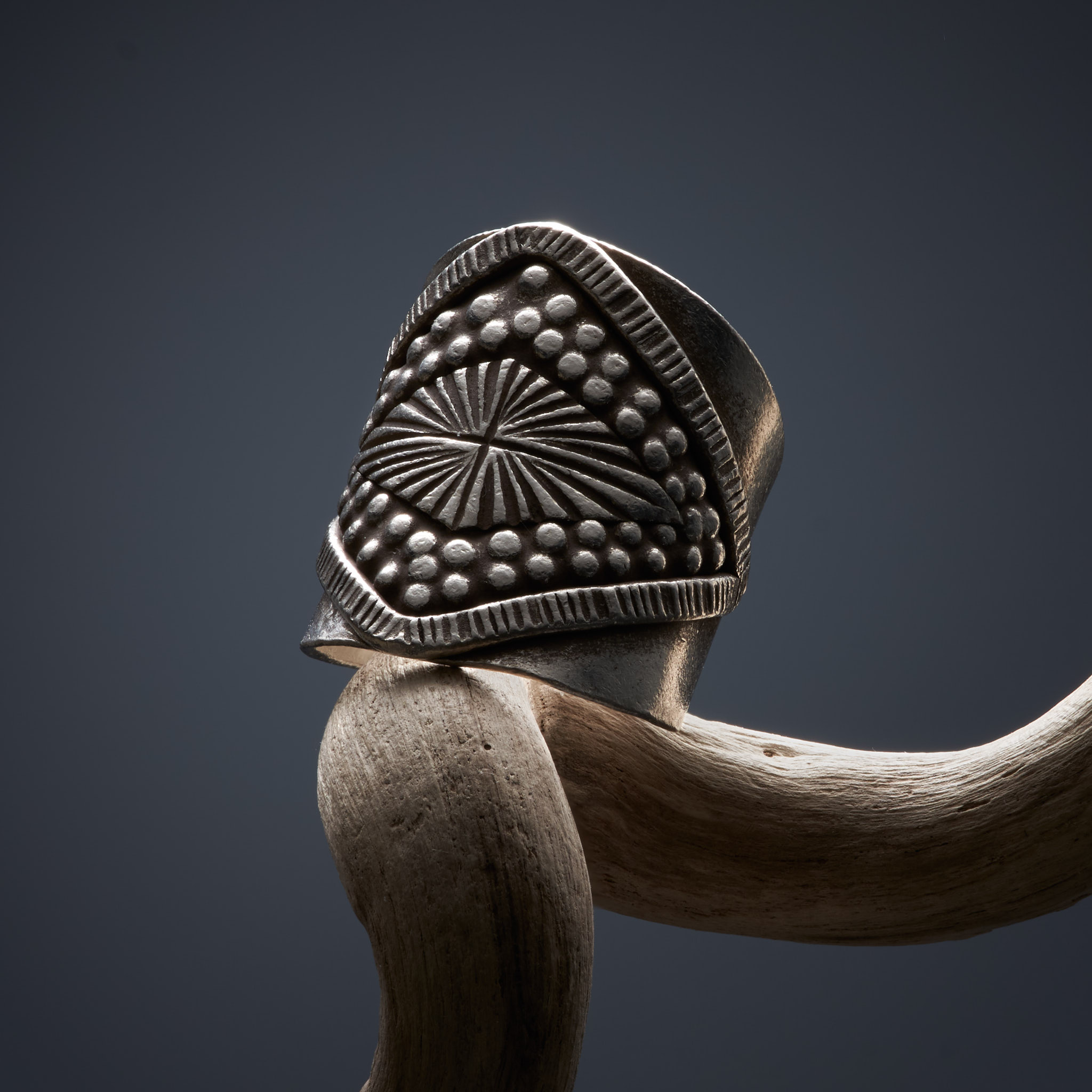 アーモンド形の銀板上に、菱形の模様を重ねた極太のカレンシルバーリングです。