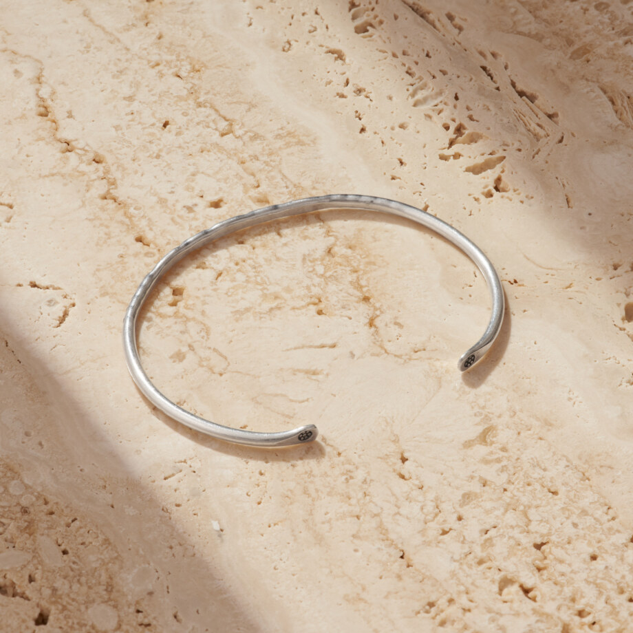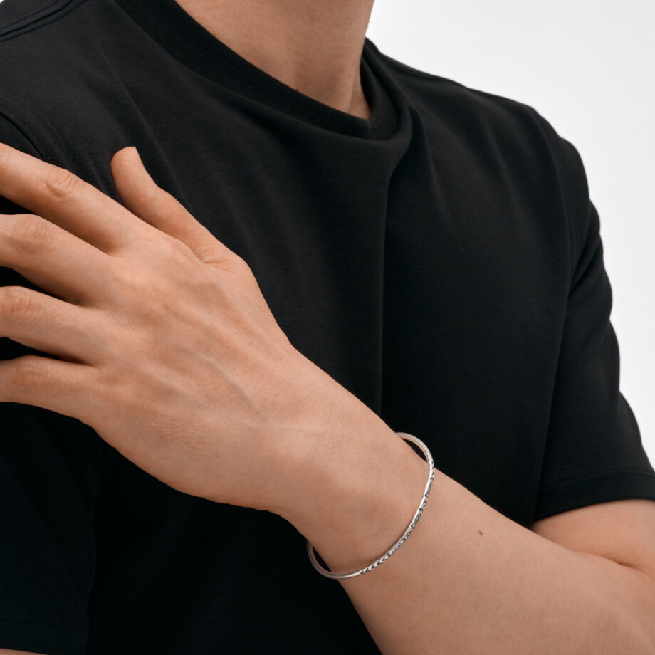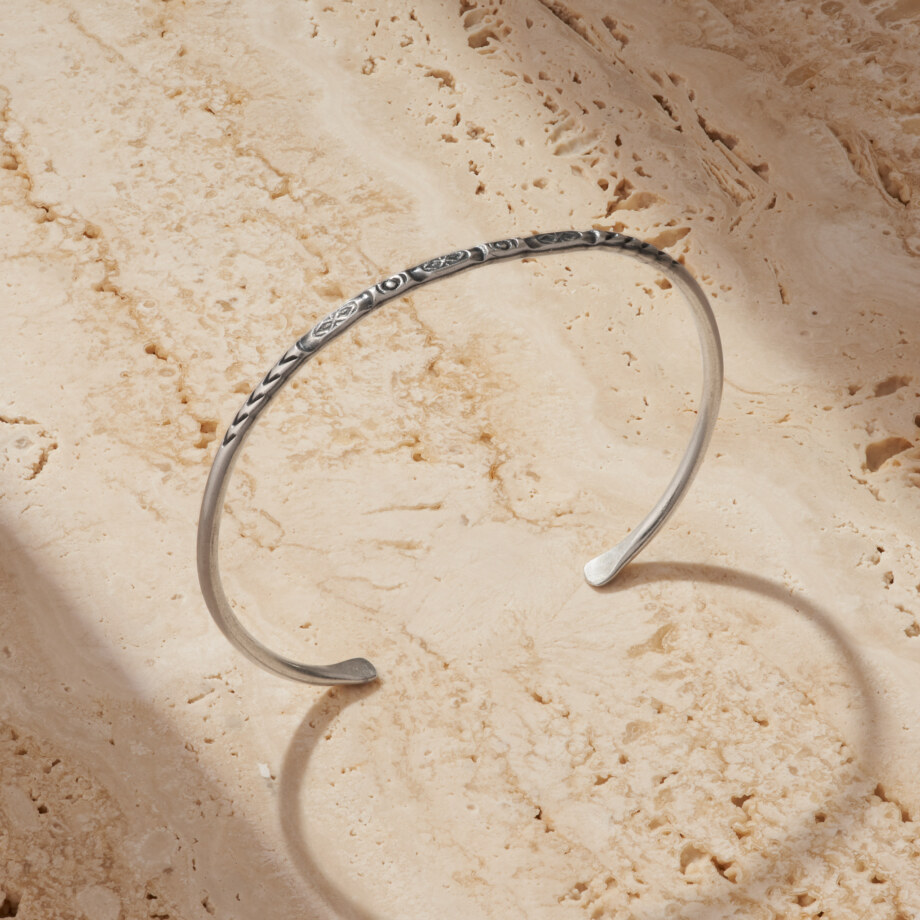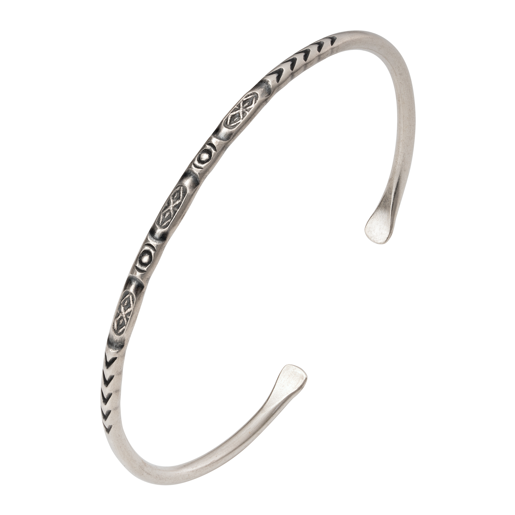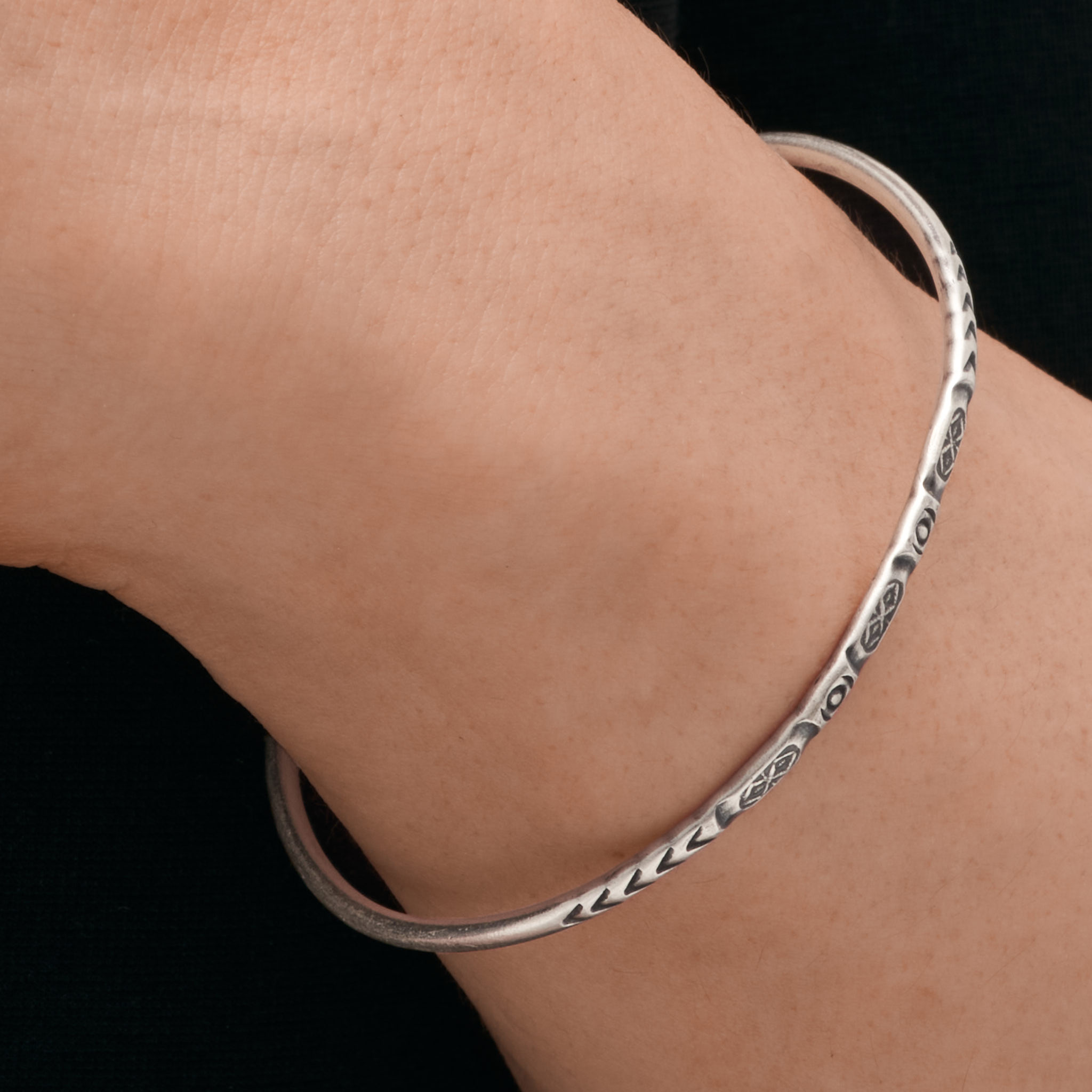 直径3mmの銀の棒に刻印を精緻に施した細身のカレンシルバーバングルです。