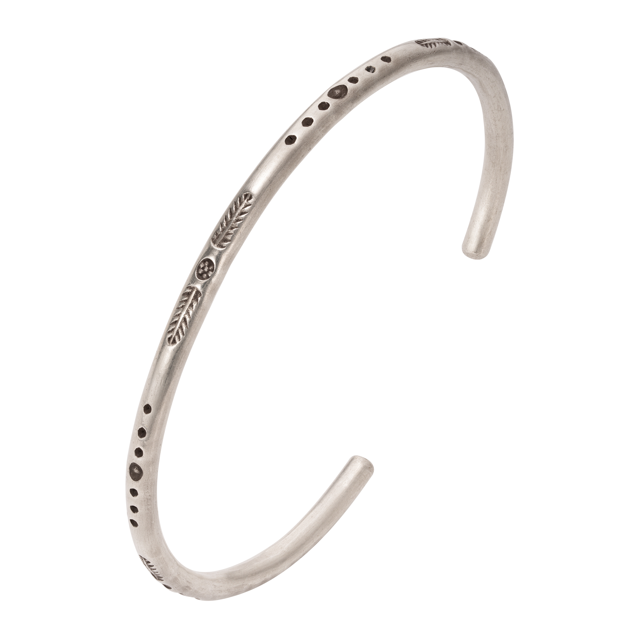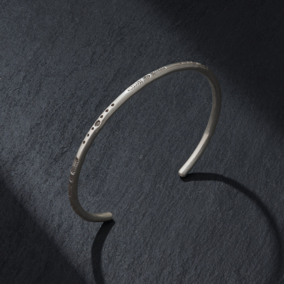 直径3mm程の銀の棒に葉の文様を打ち込んだ細身のカレンシルバーバングルです。