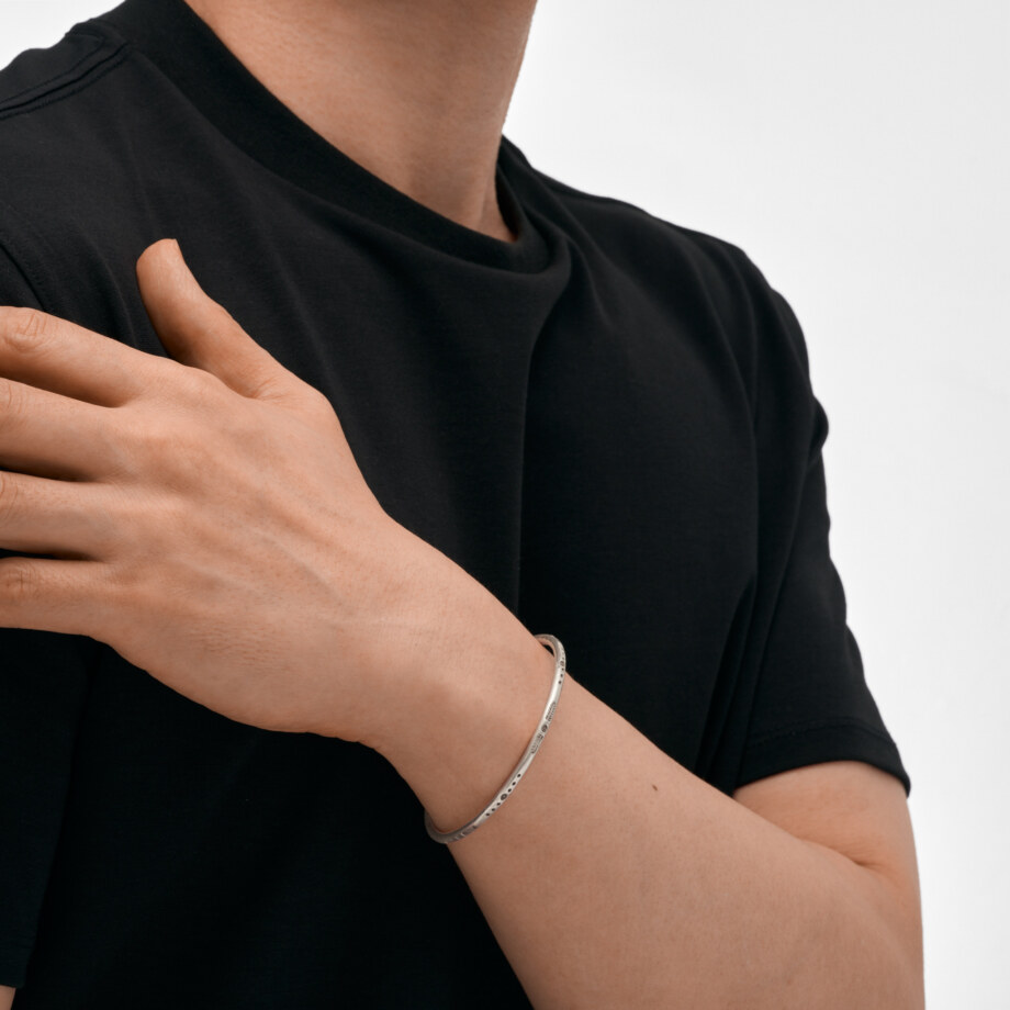 丸みのある形状は肌への当たりが優しく、ひとすじの銀の光が手首をすっきり見せます。