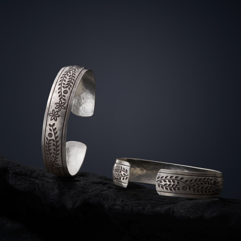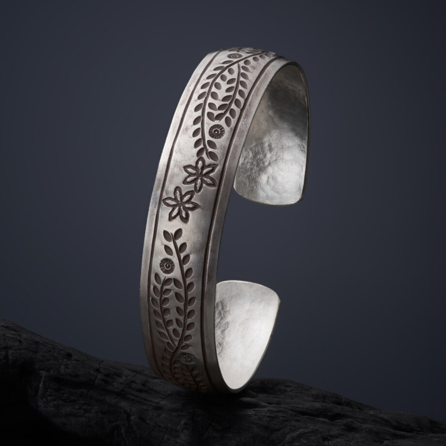 植物文様をぐるりと一面にあしらい、まるで月桂樹の冠のような極太のカレンシルバーバングルです。