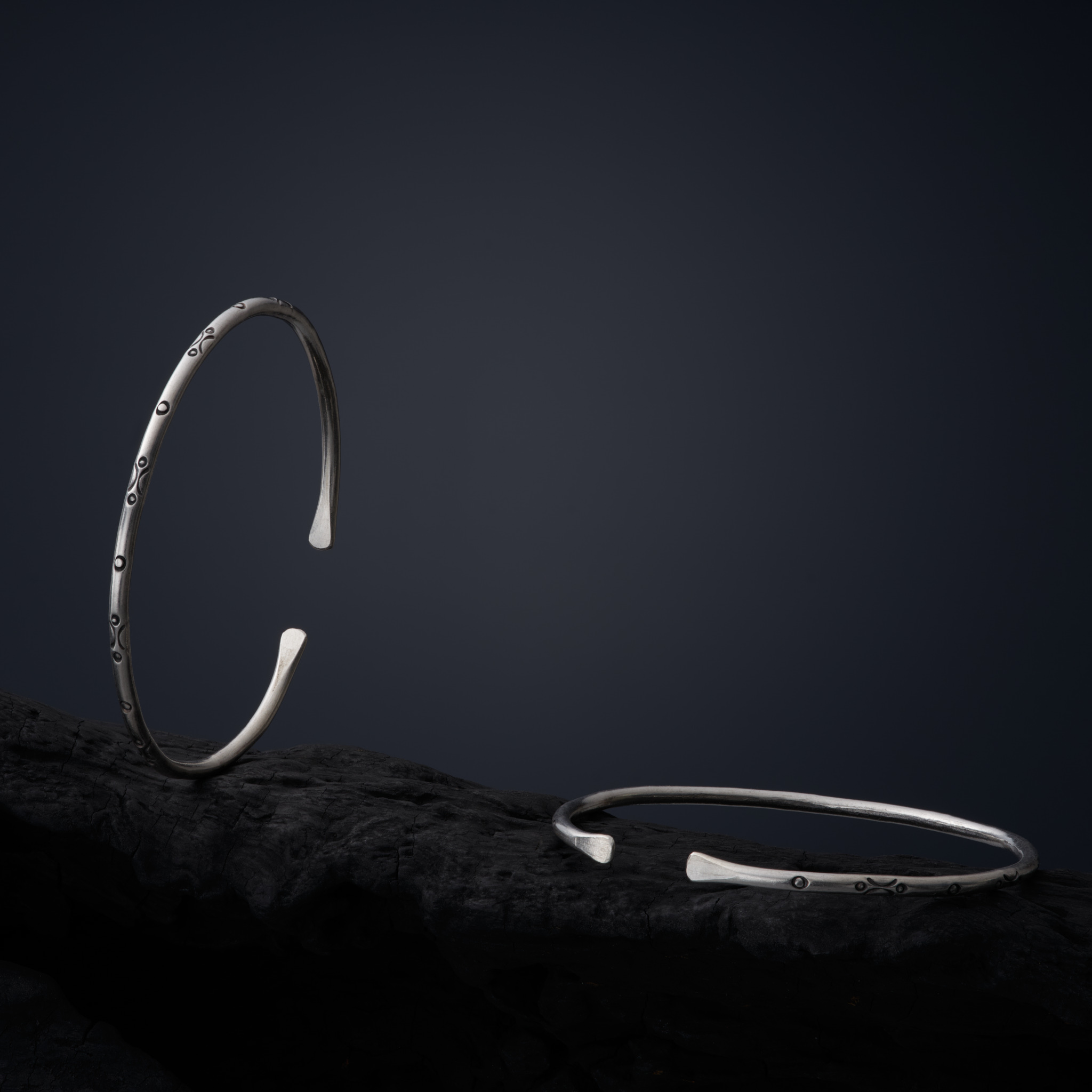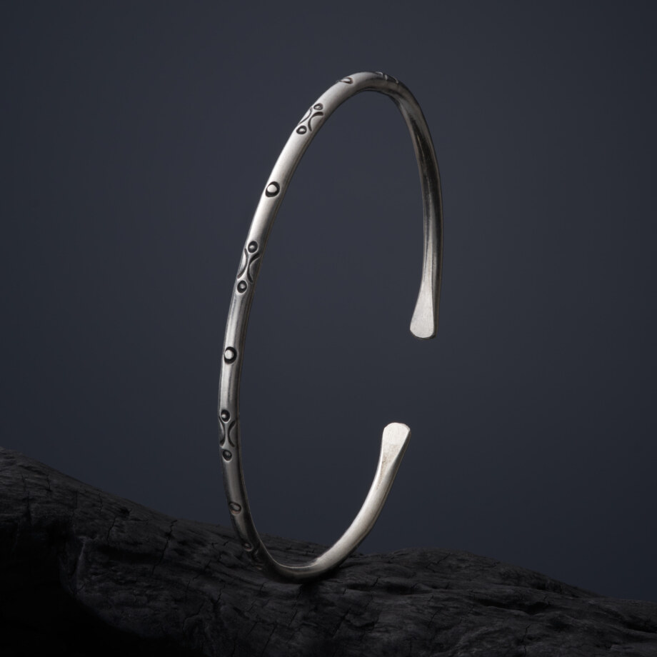 幅2.5mmで極細の銀棒に、刻印を等間隔に打ち込んだカレンシルバーバングルです。