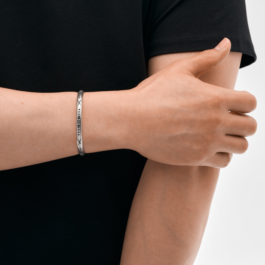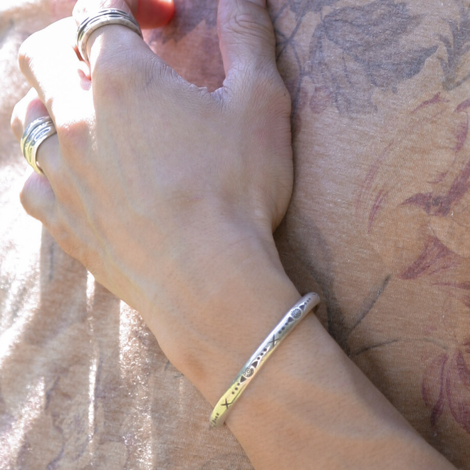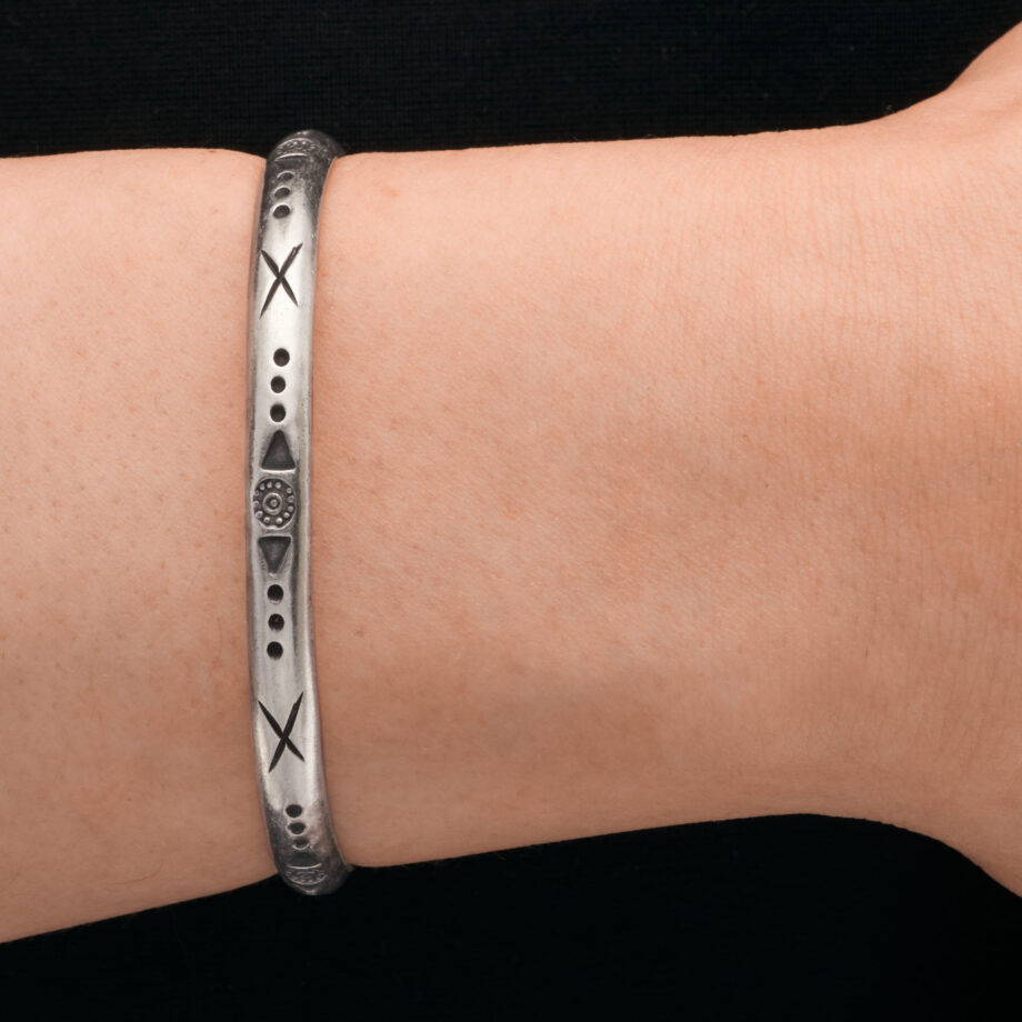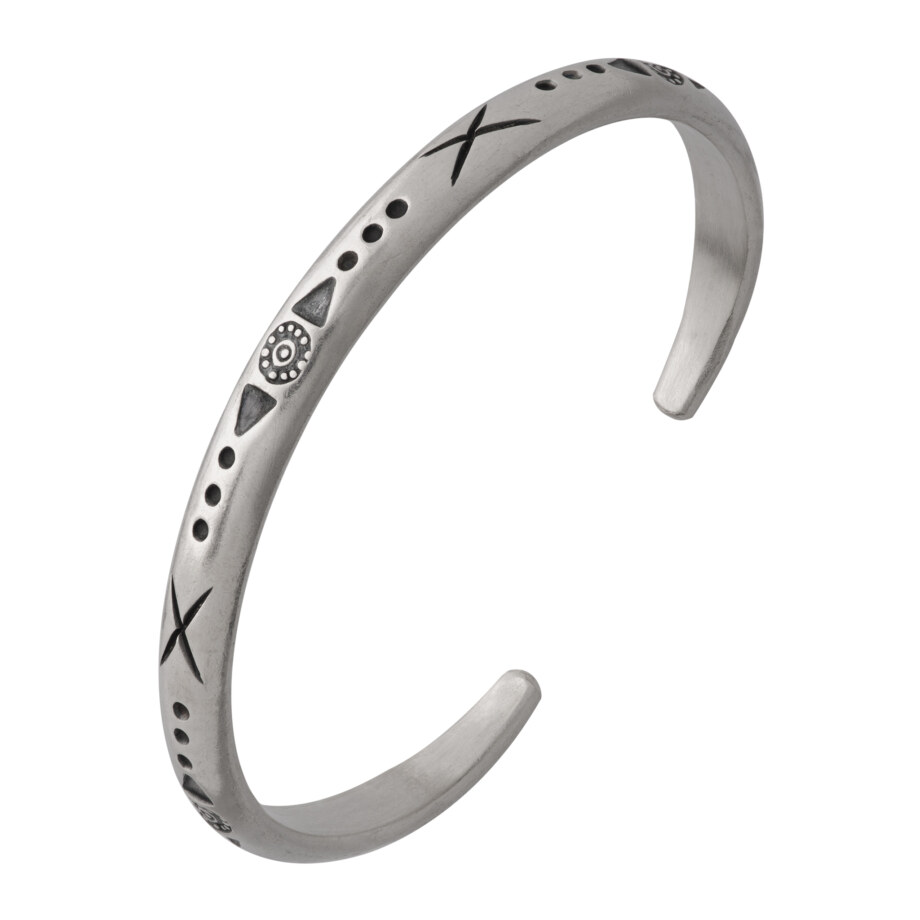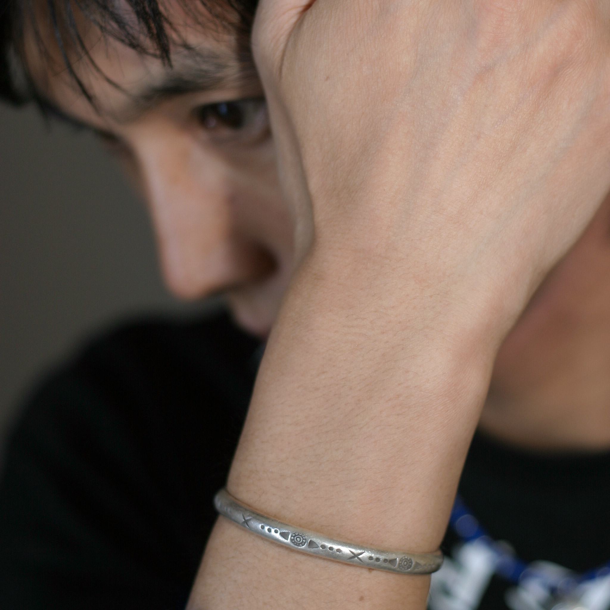 幾何学文様に刻印を打ち込んだ重量感ある甲丸のカレンシルバーバングルです。