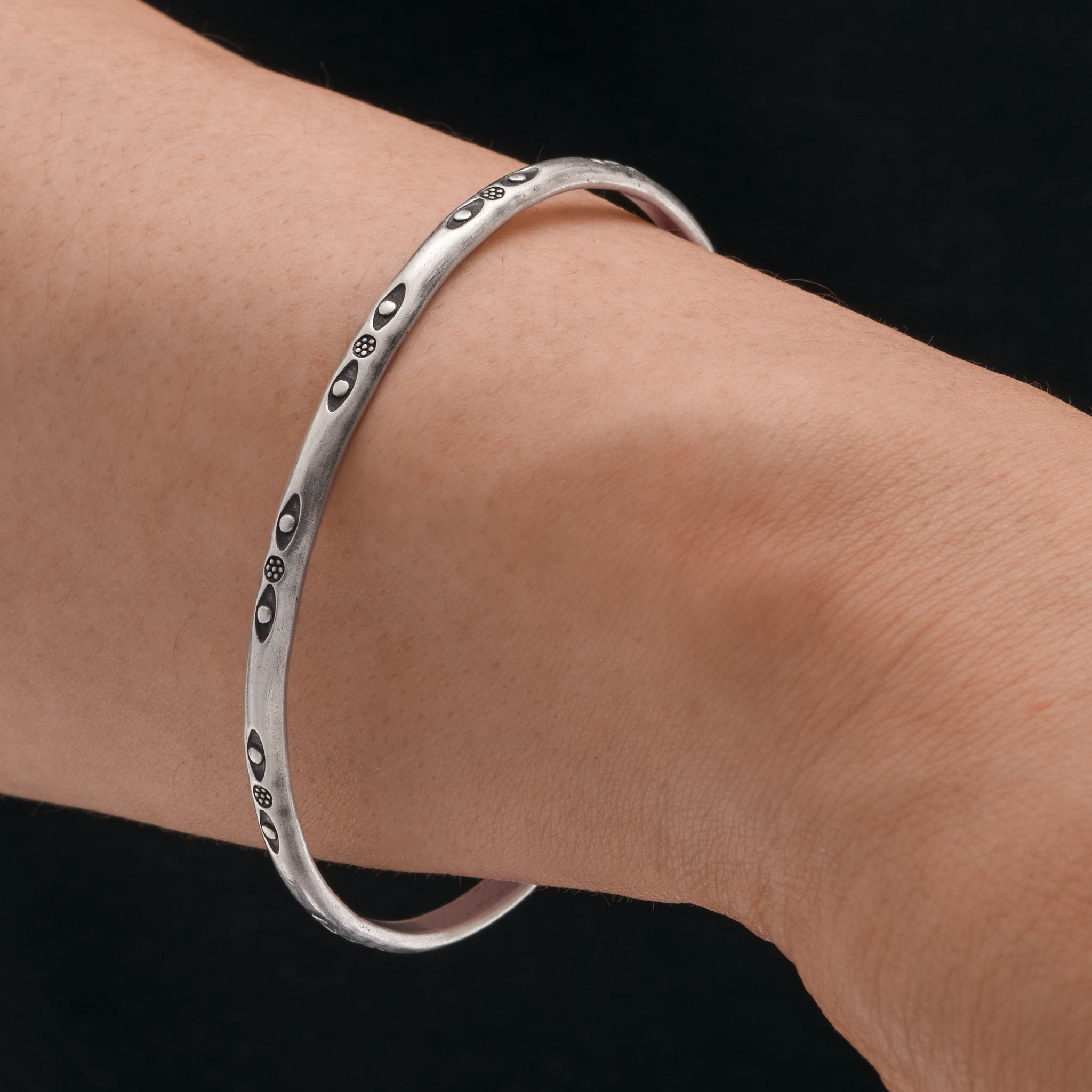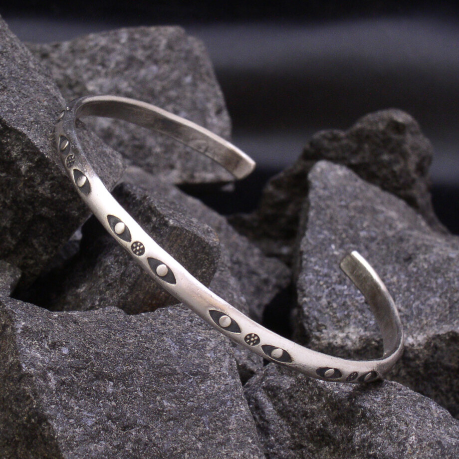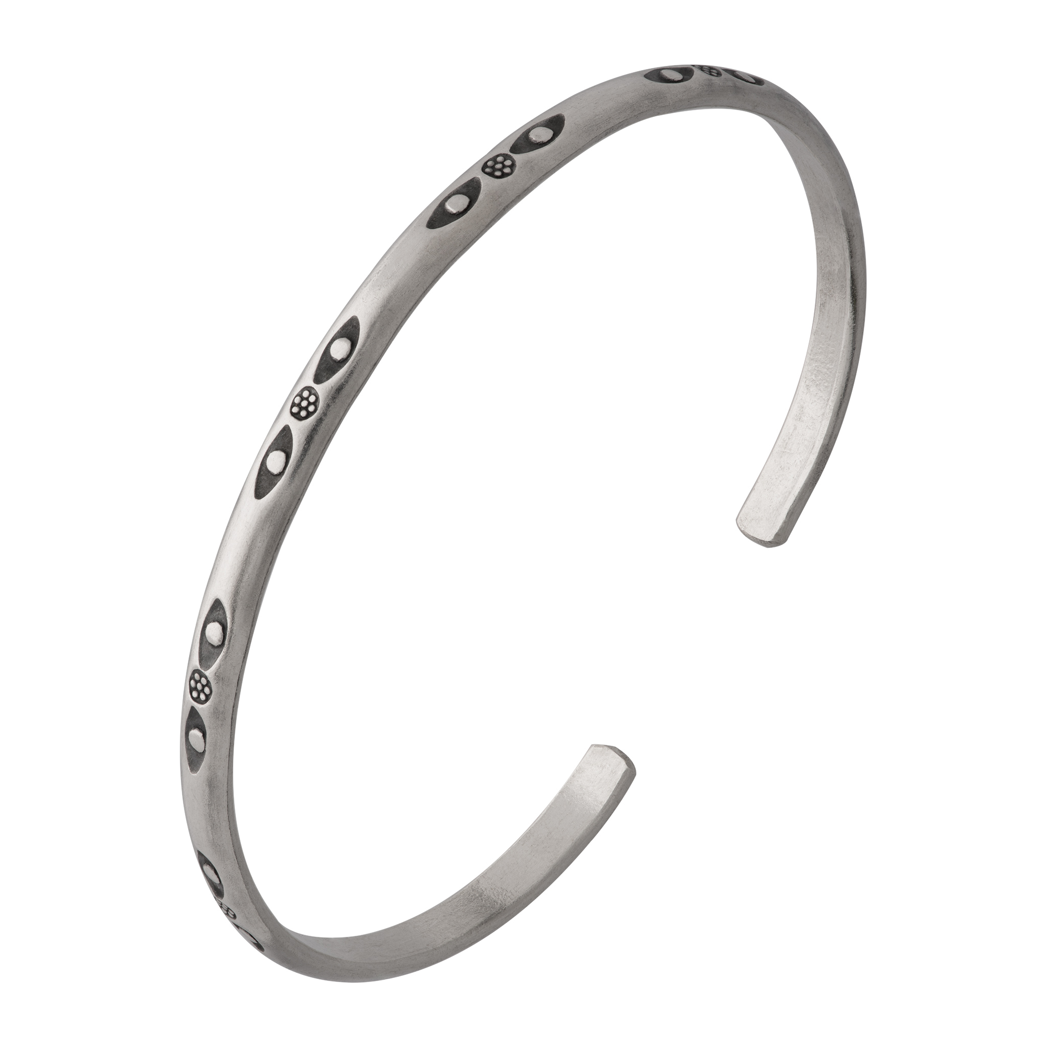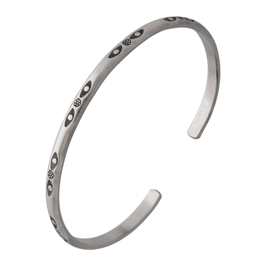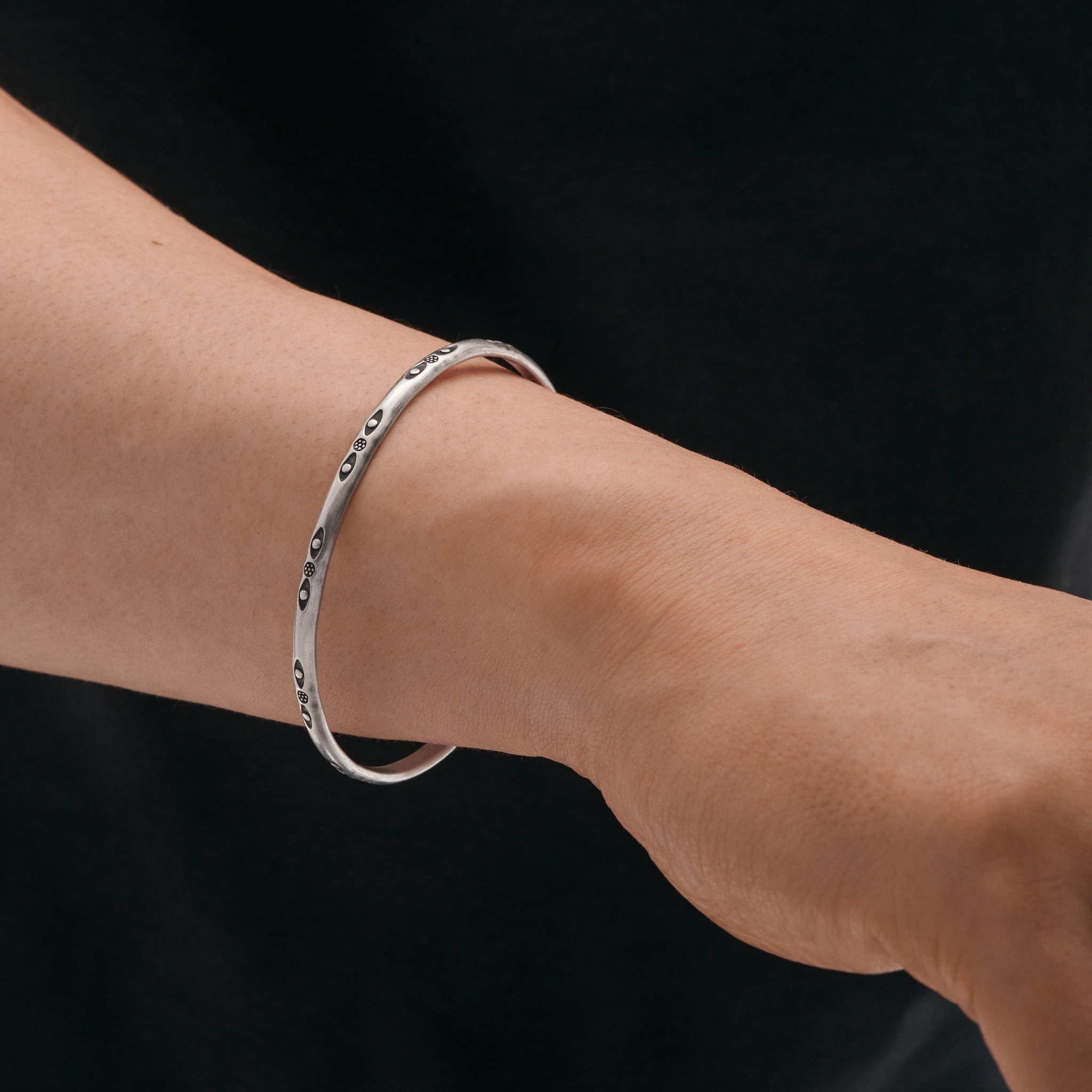 「眼」がモチーフの刻印が打ち込まれた、細身で甲丸のカレンシルバーバングルです。