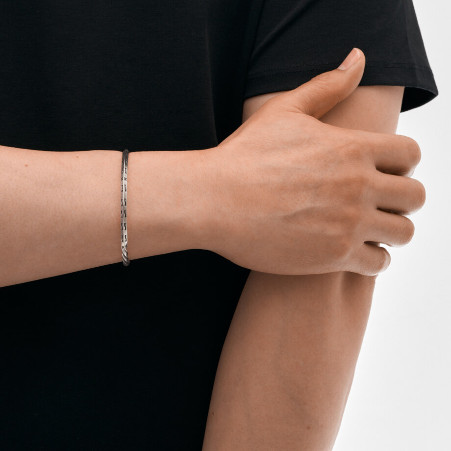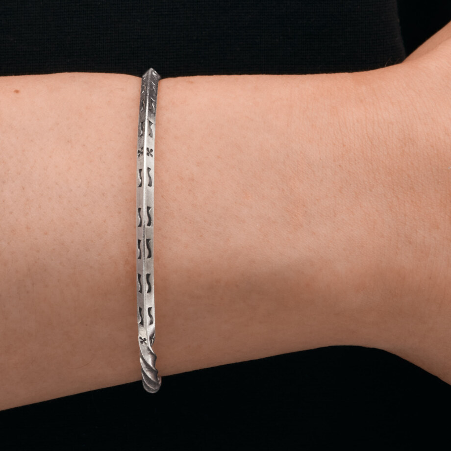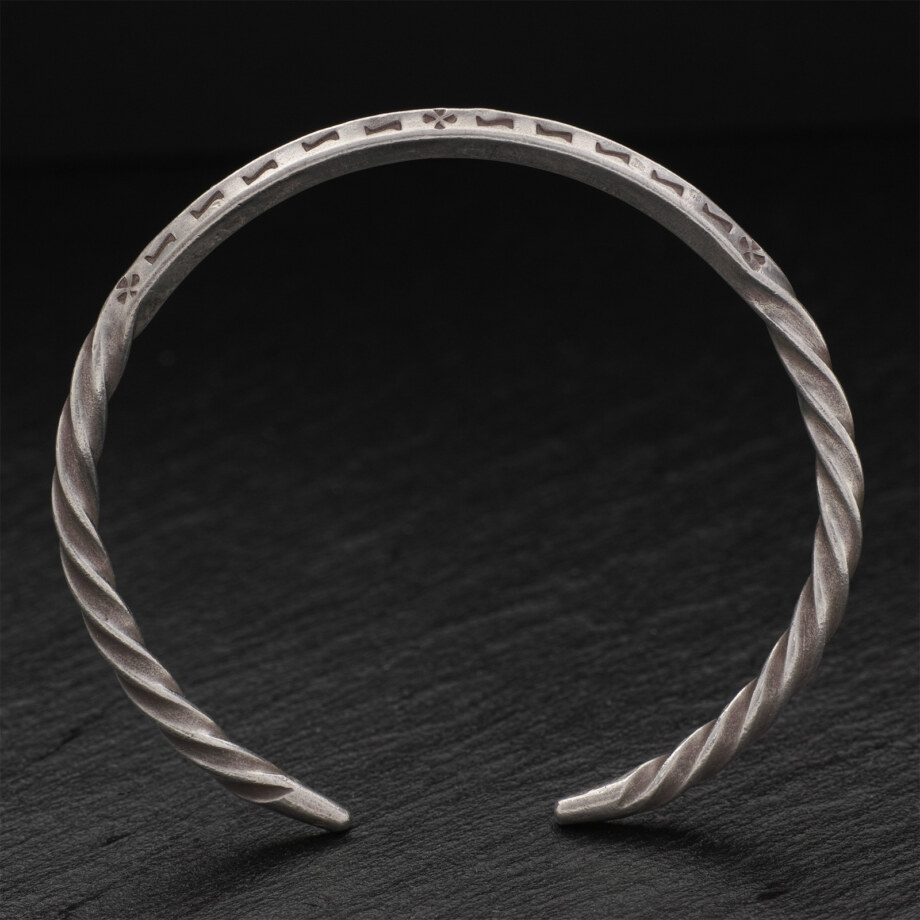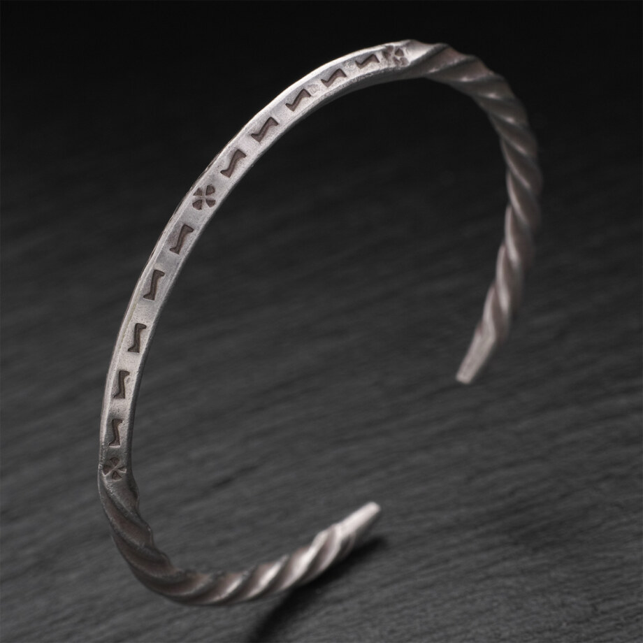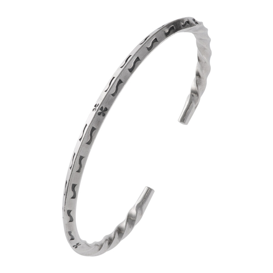 中央の菱形から両端が螺旋形へ変化する、独特なフォルムを持つカレンシルバーバングルです。