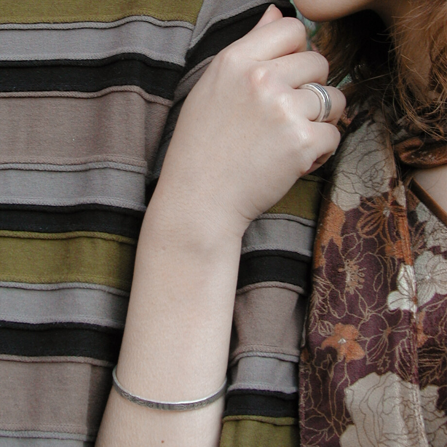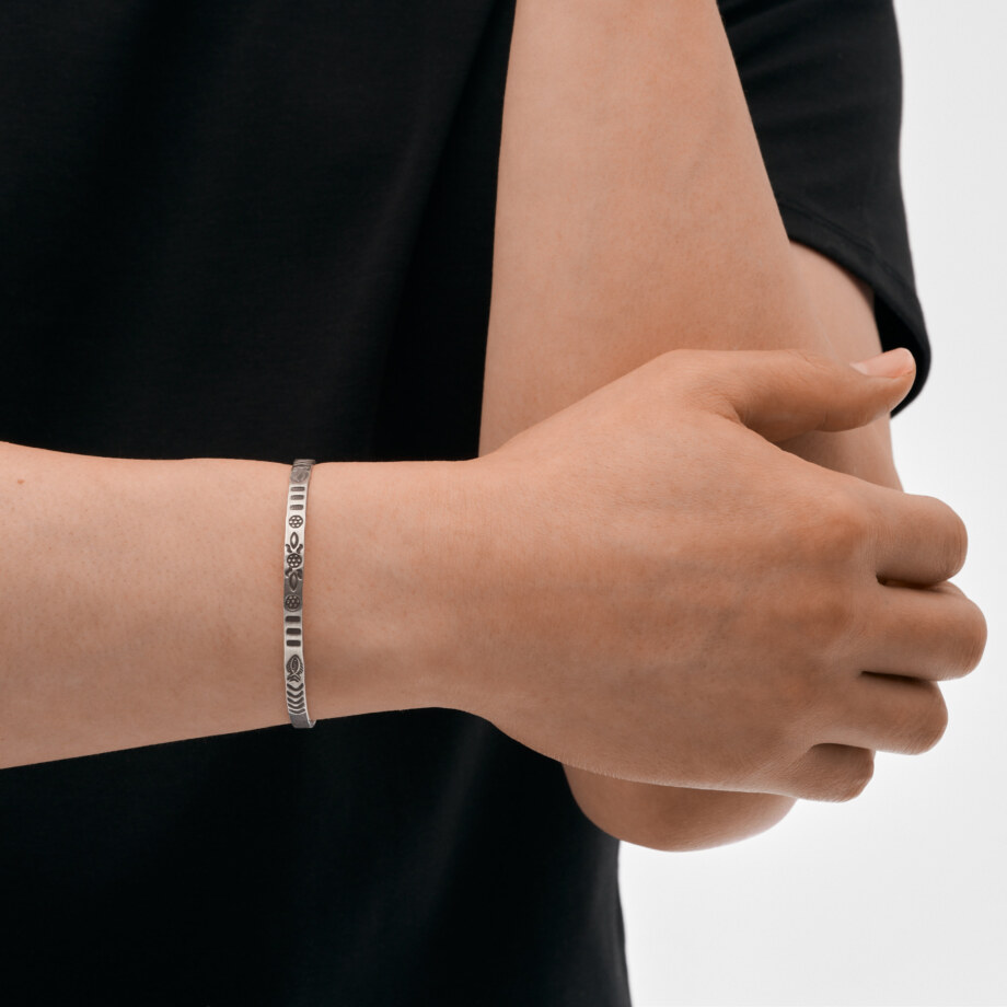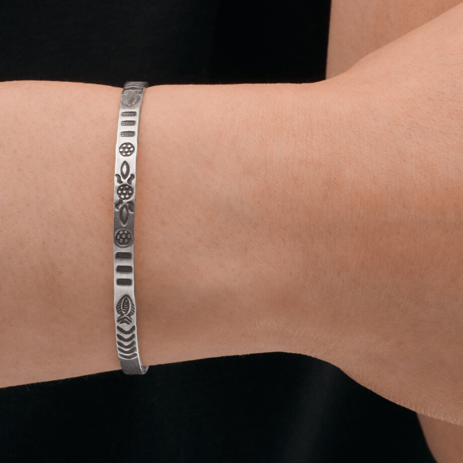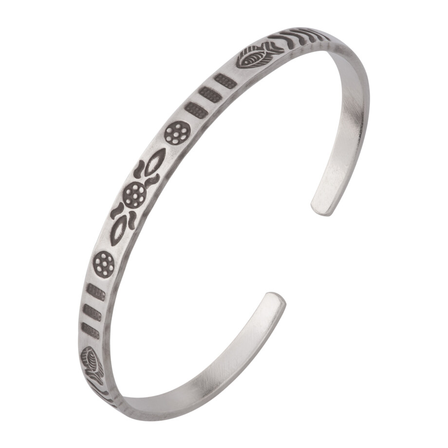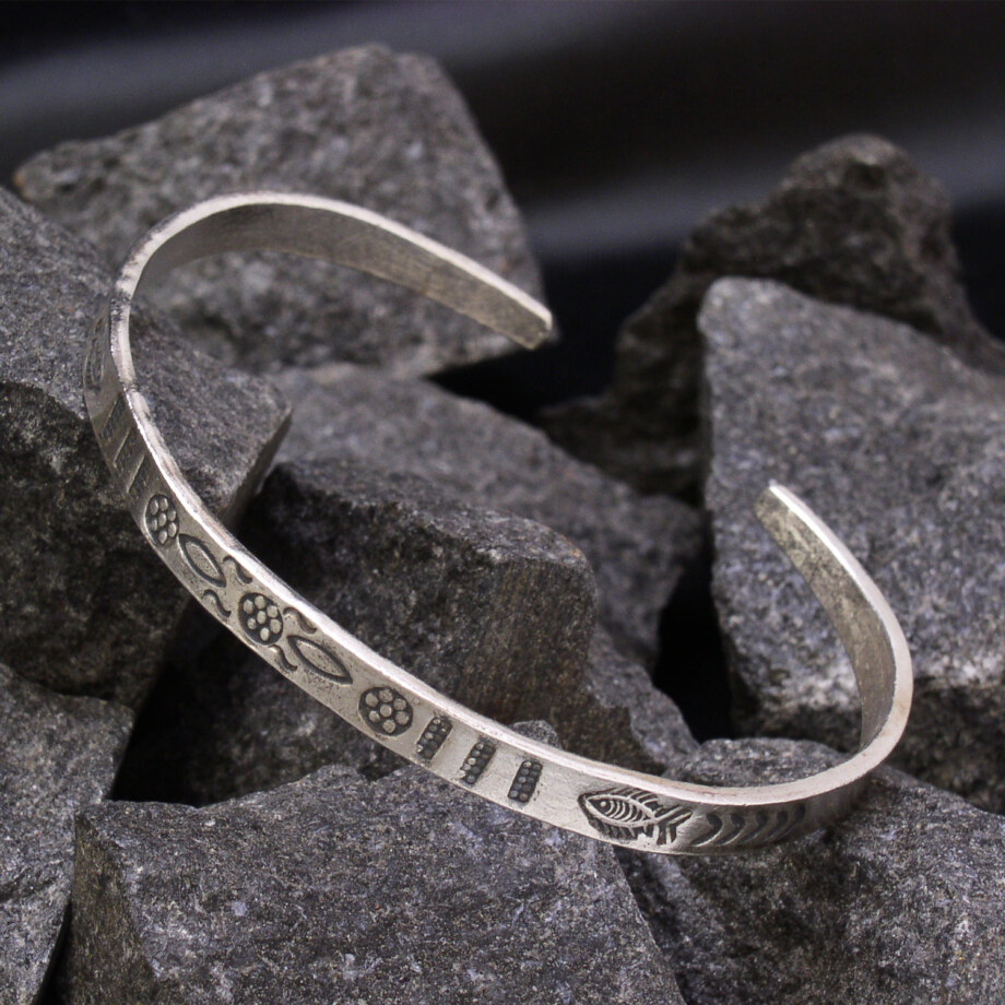 魚を含む多彩な刻印が打ち込まれた平打ちのカレンシルバーバングルです。
