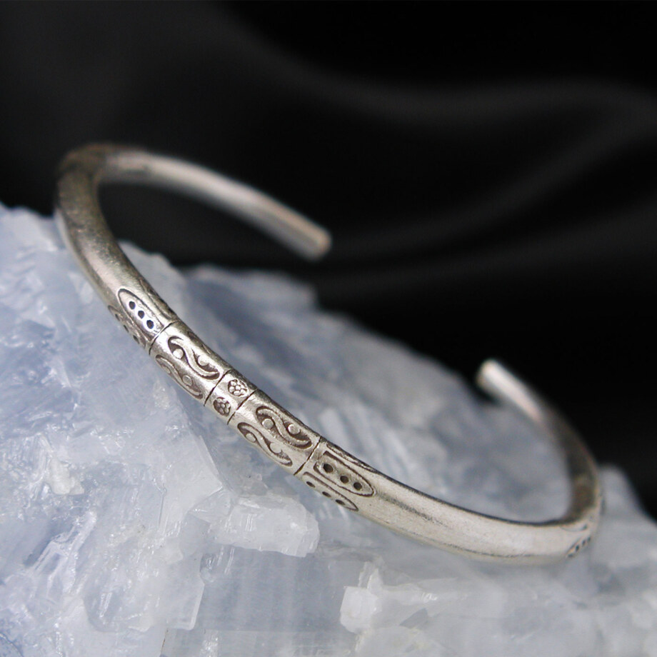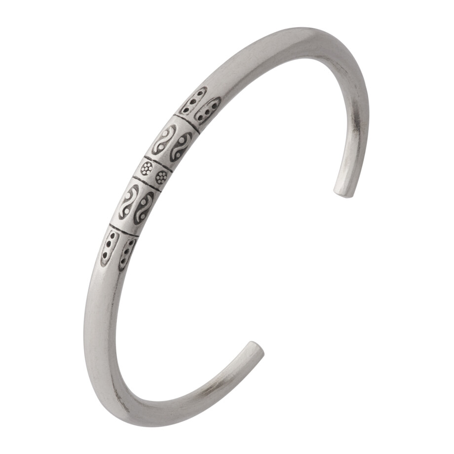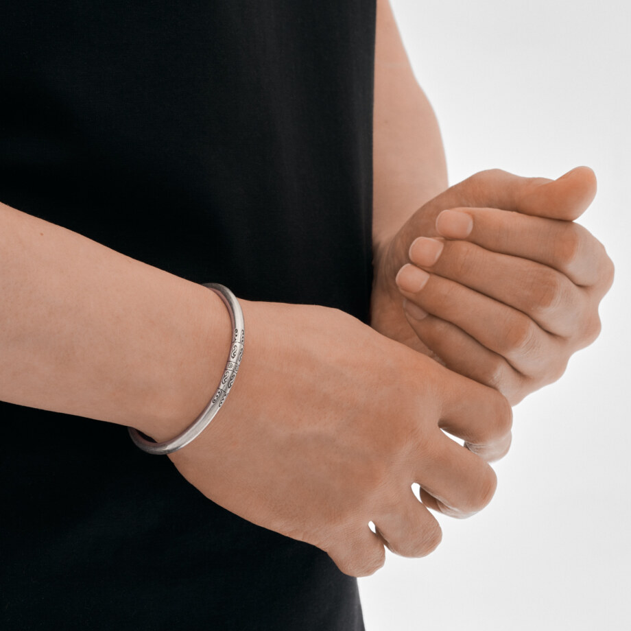 中央に「陰陽」の刻印をあしらい、末端にかけ徐々に細くなる丸形のカレンシルバーバングルです。