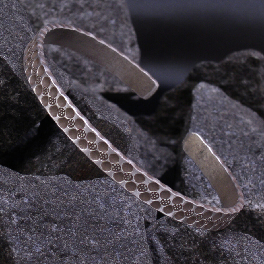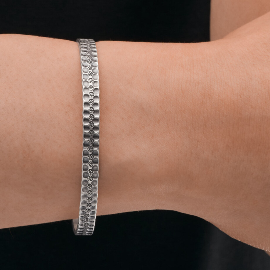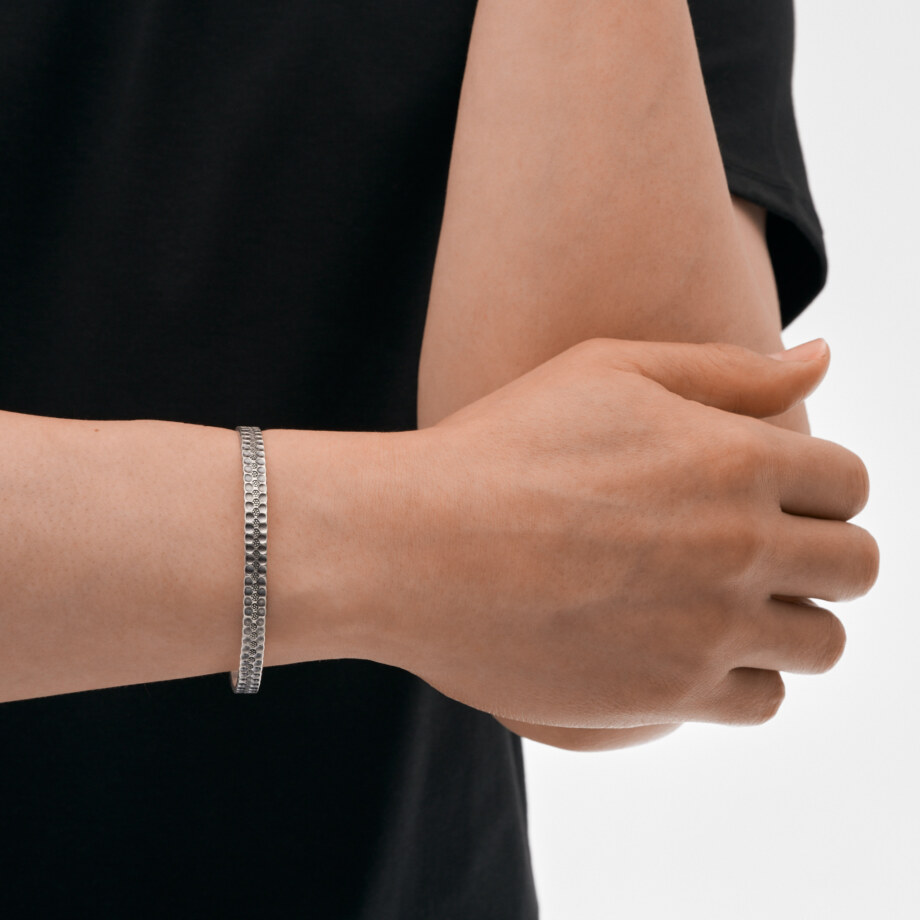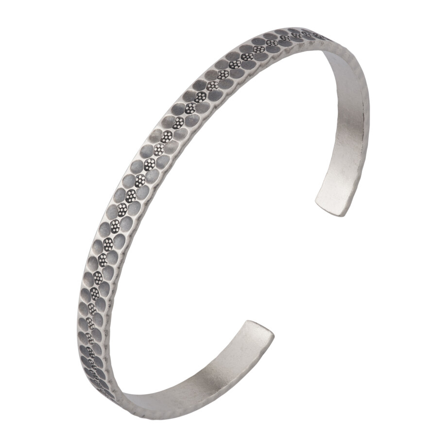 厚みのある銀板をシンプルな刻印で埋めつくした、平打ちのカレンシルバーバングルです。