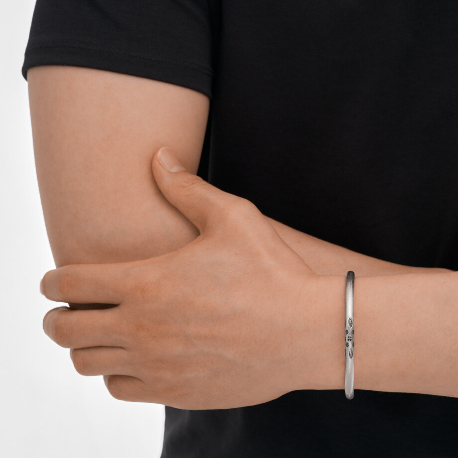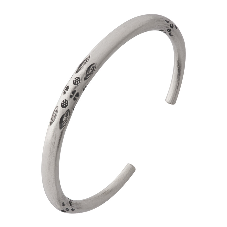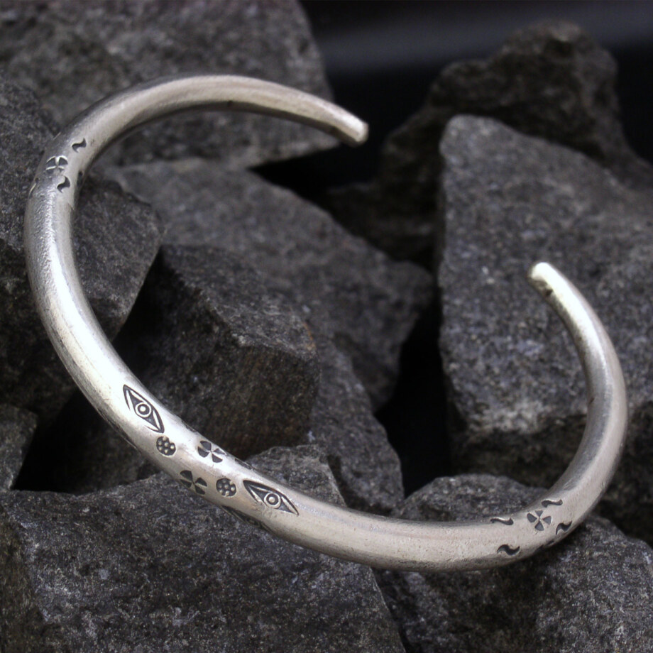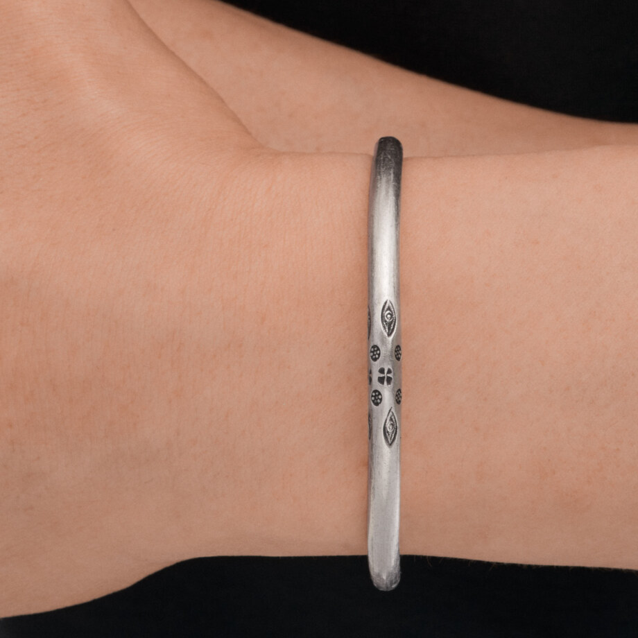 大きな「眼」の刻印が正視する重量感たっぷりで丸形のカレンシルバーバングルです。
