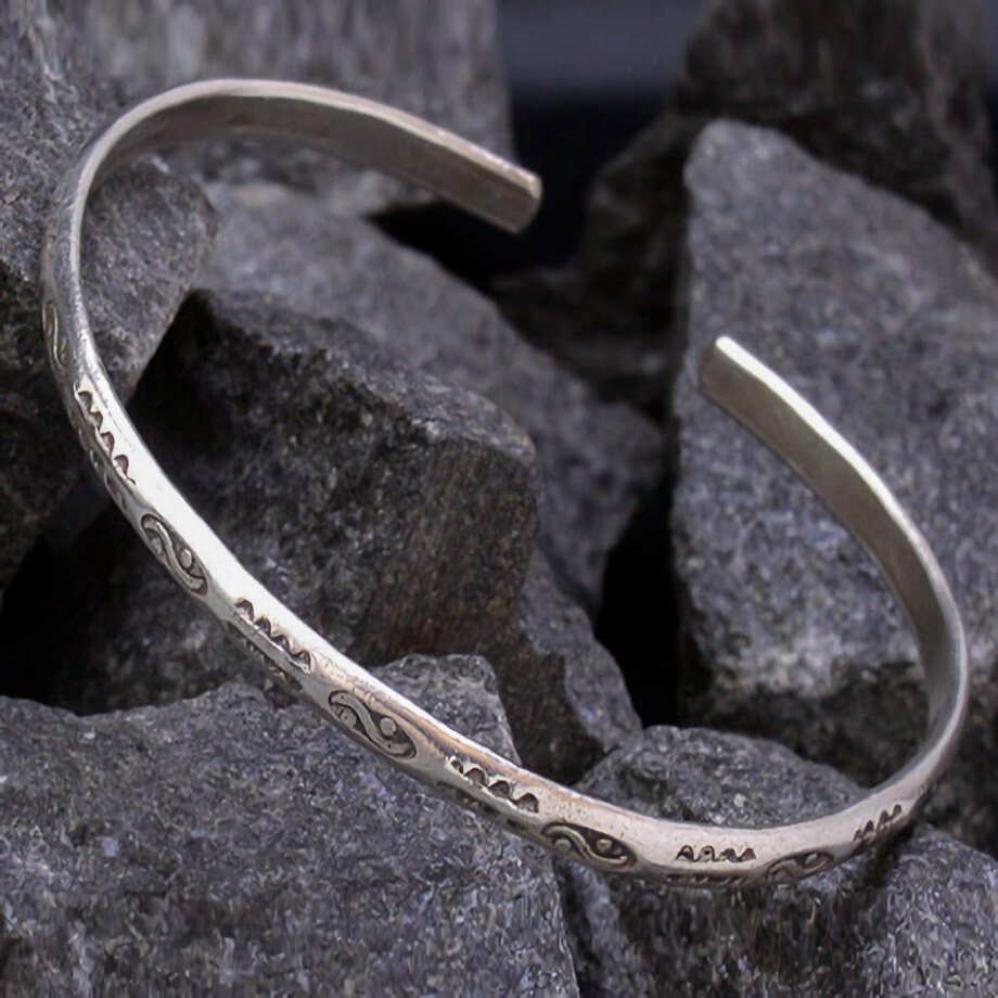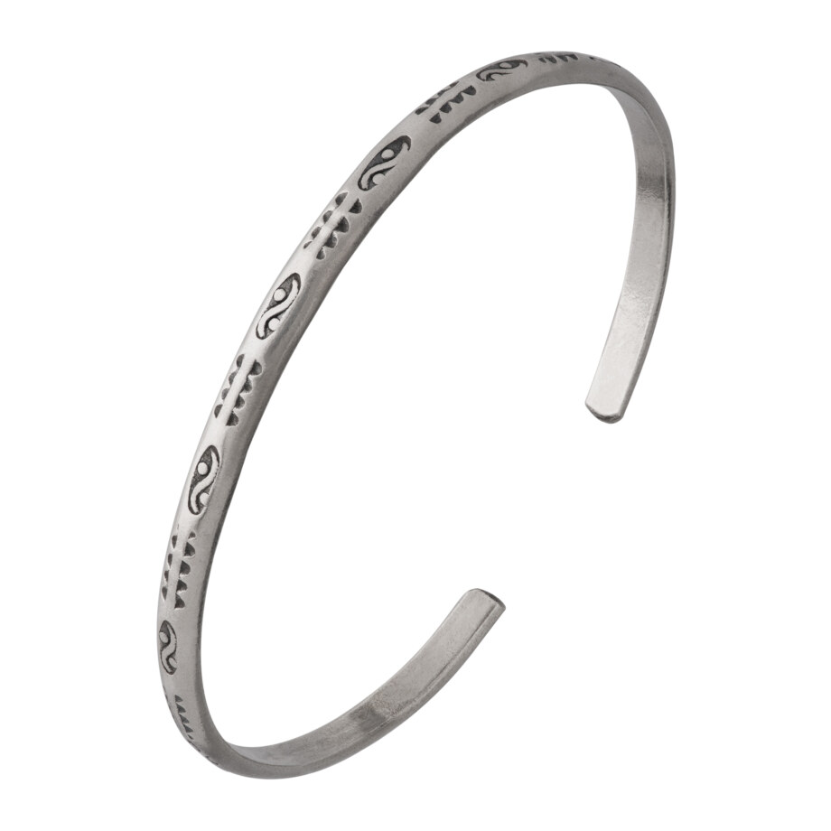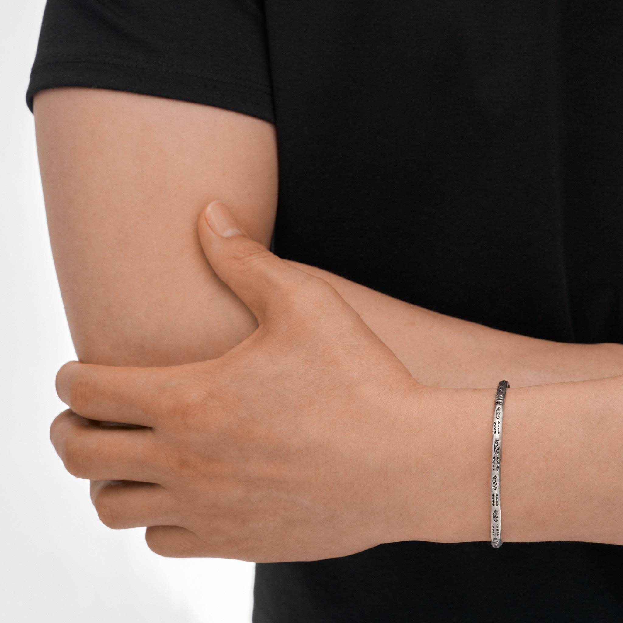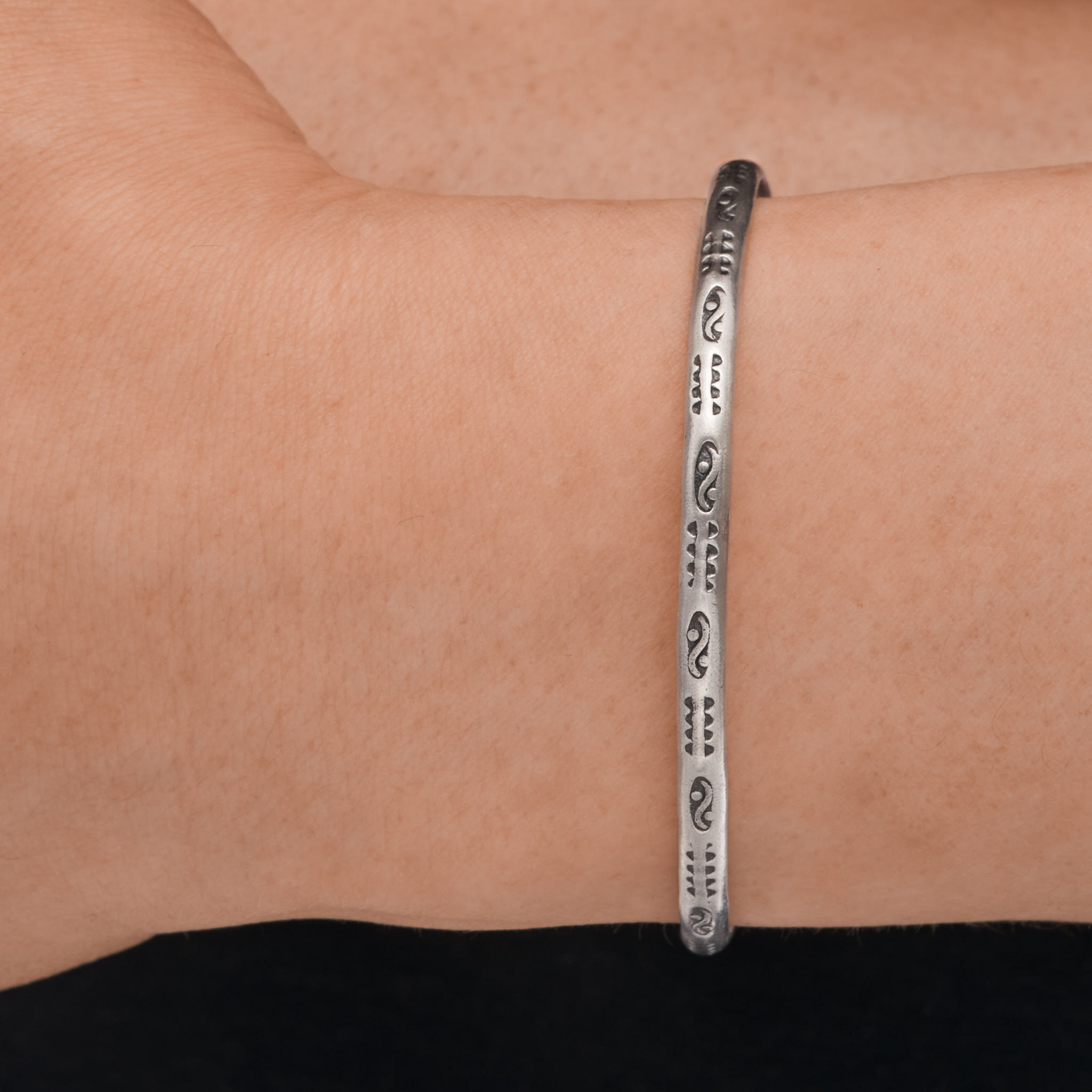 「陰陽」と「芋虫」の刻印を交互にあしらった、細身で甲丸のカレンシルバーバングルです。