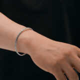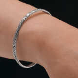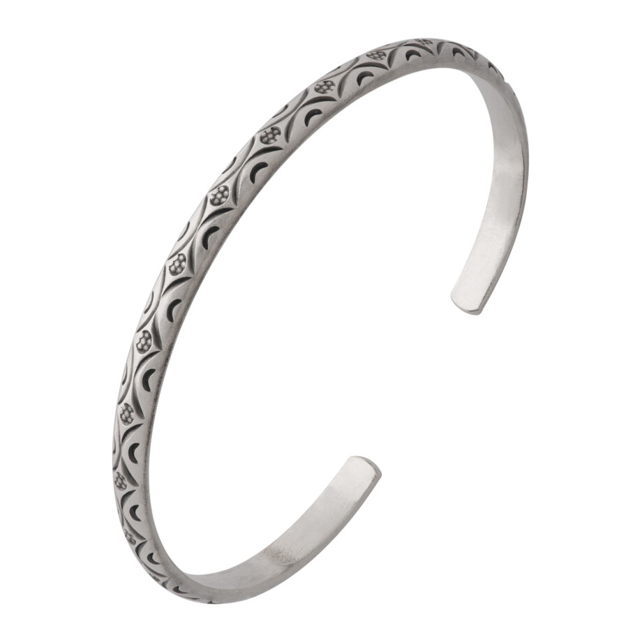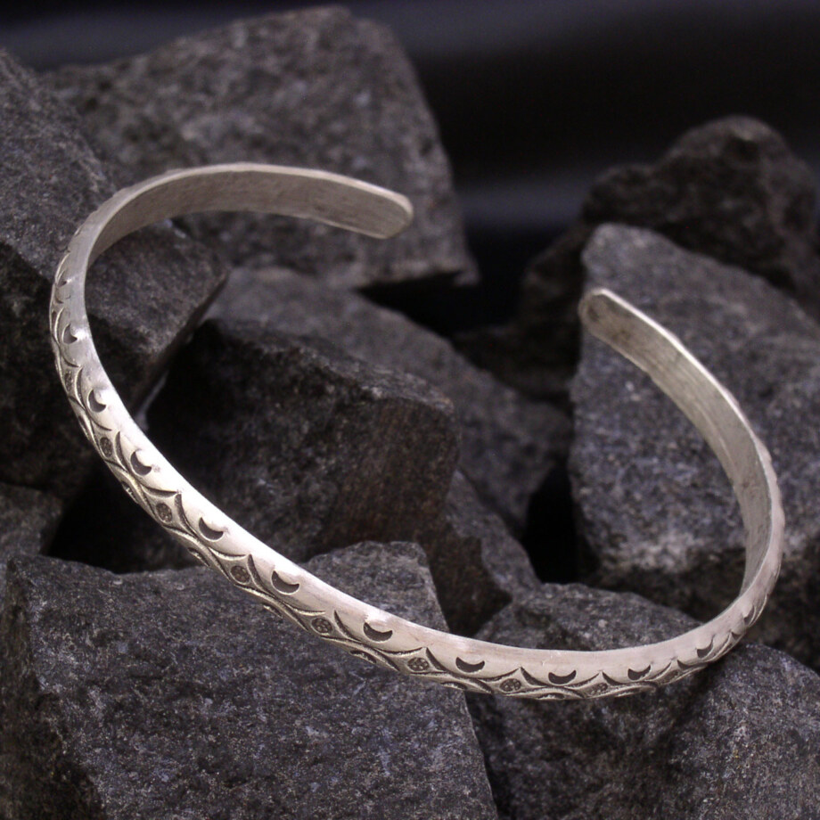 刻印が隙間なく打ち込まれた細身で甲丸のカレンシルバーバングルです。