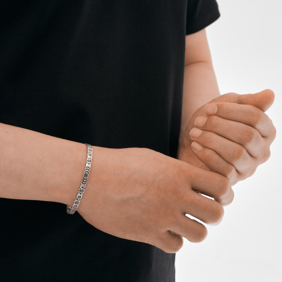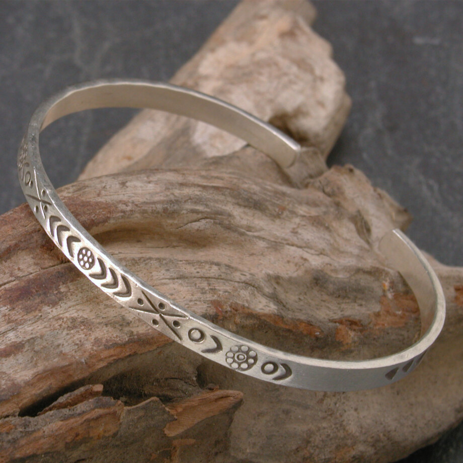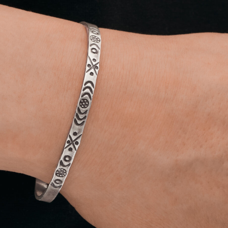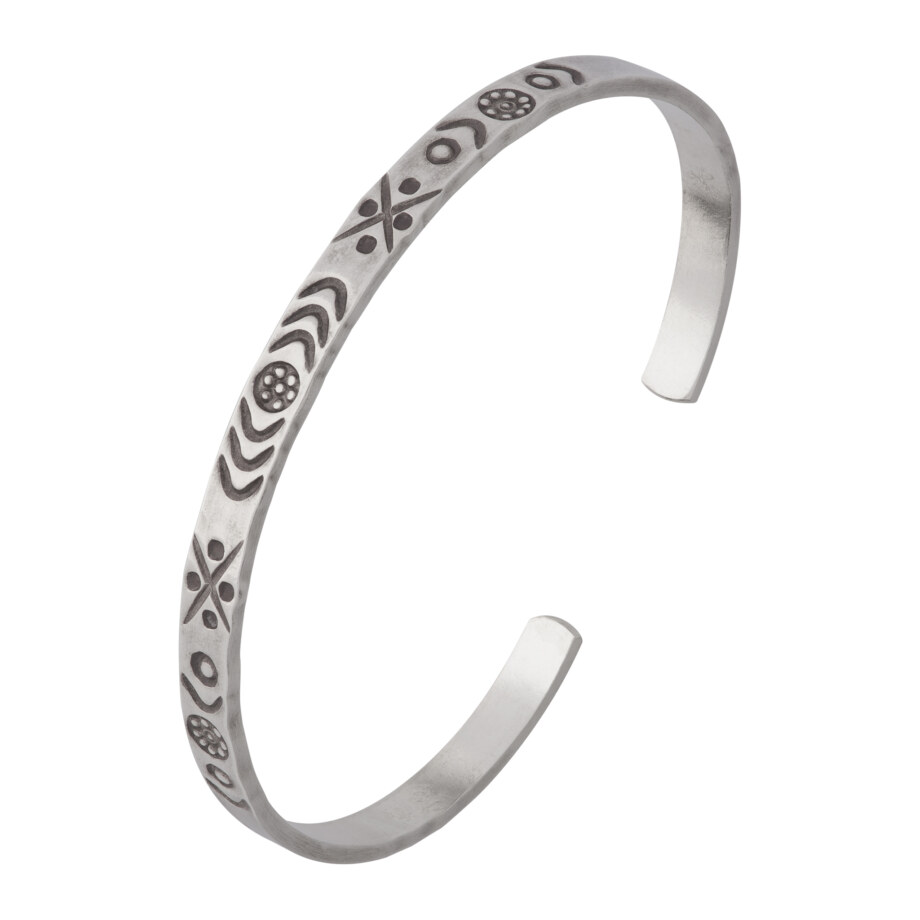 多種多彩な刻印が一面に施された平打ちのカレンシルバーバングルです。