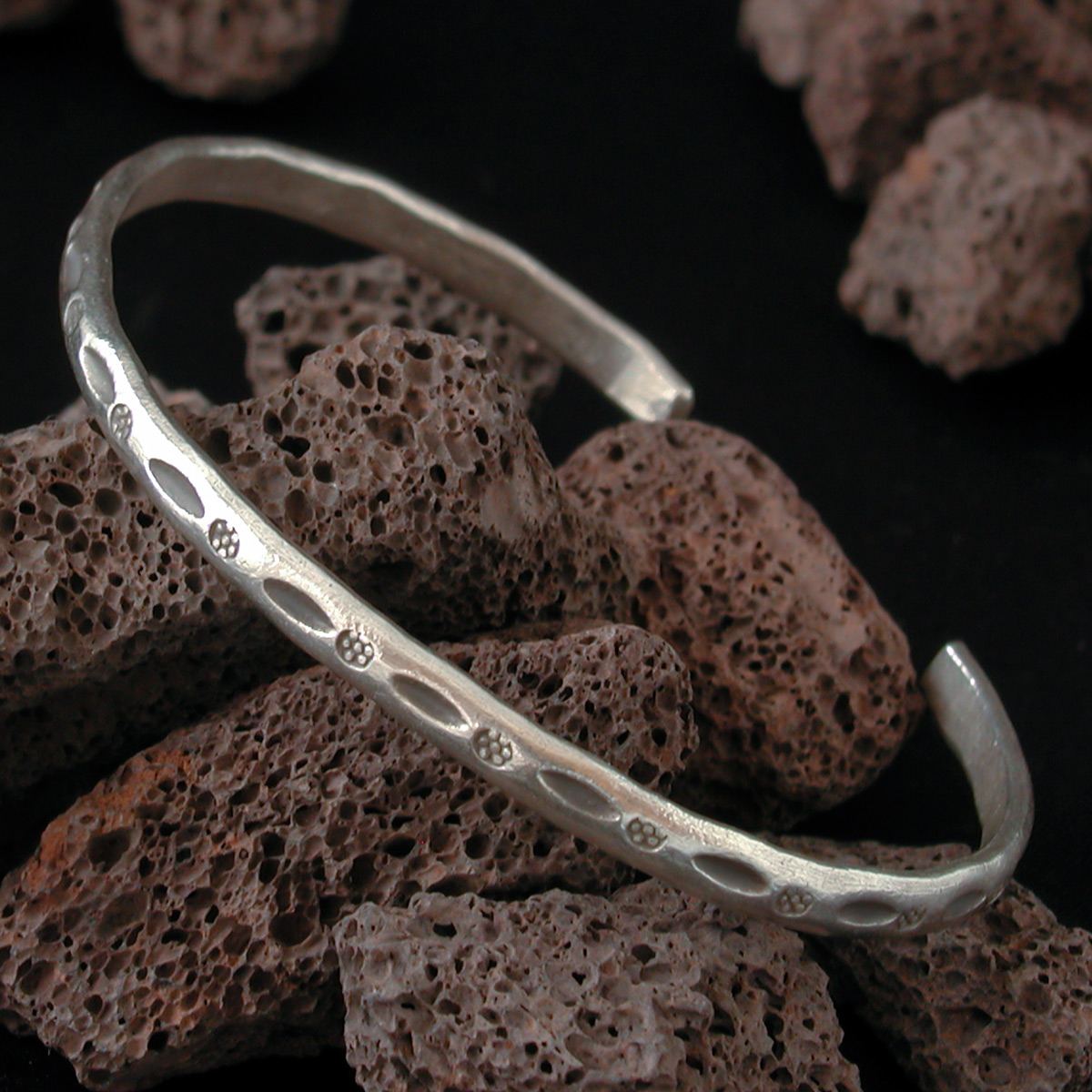 シンプルな刻印を交互に配した細身で甲丸のカレンシルバーバングルです。