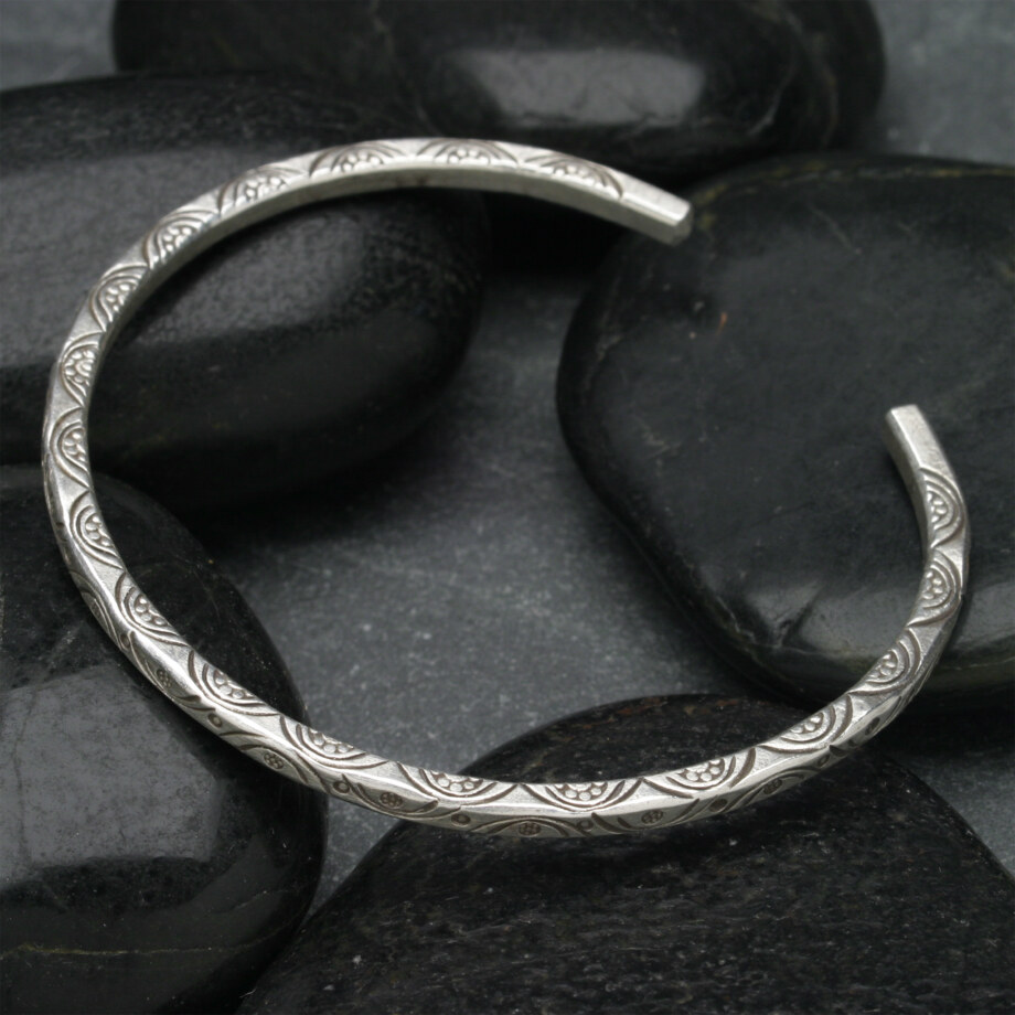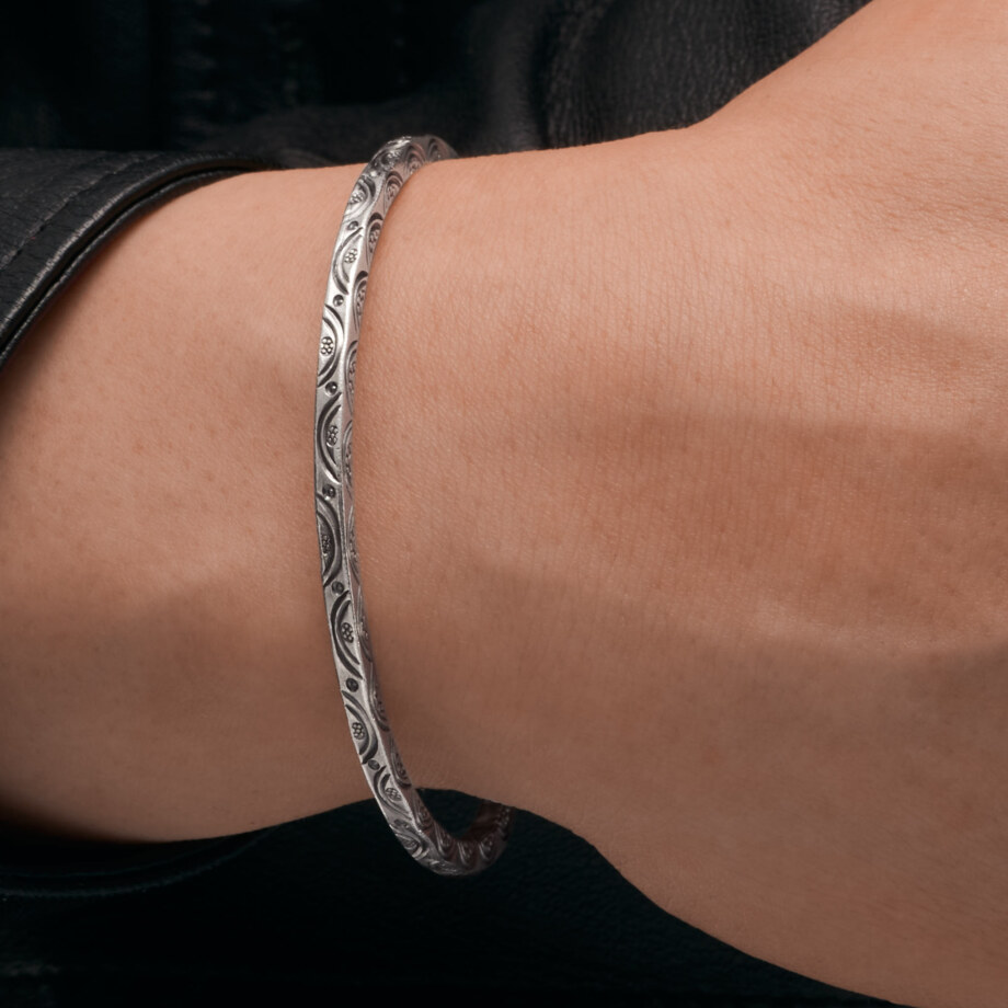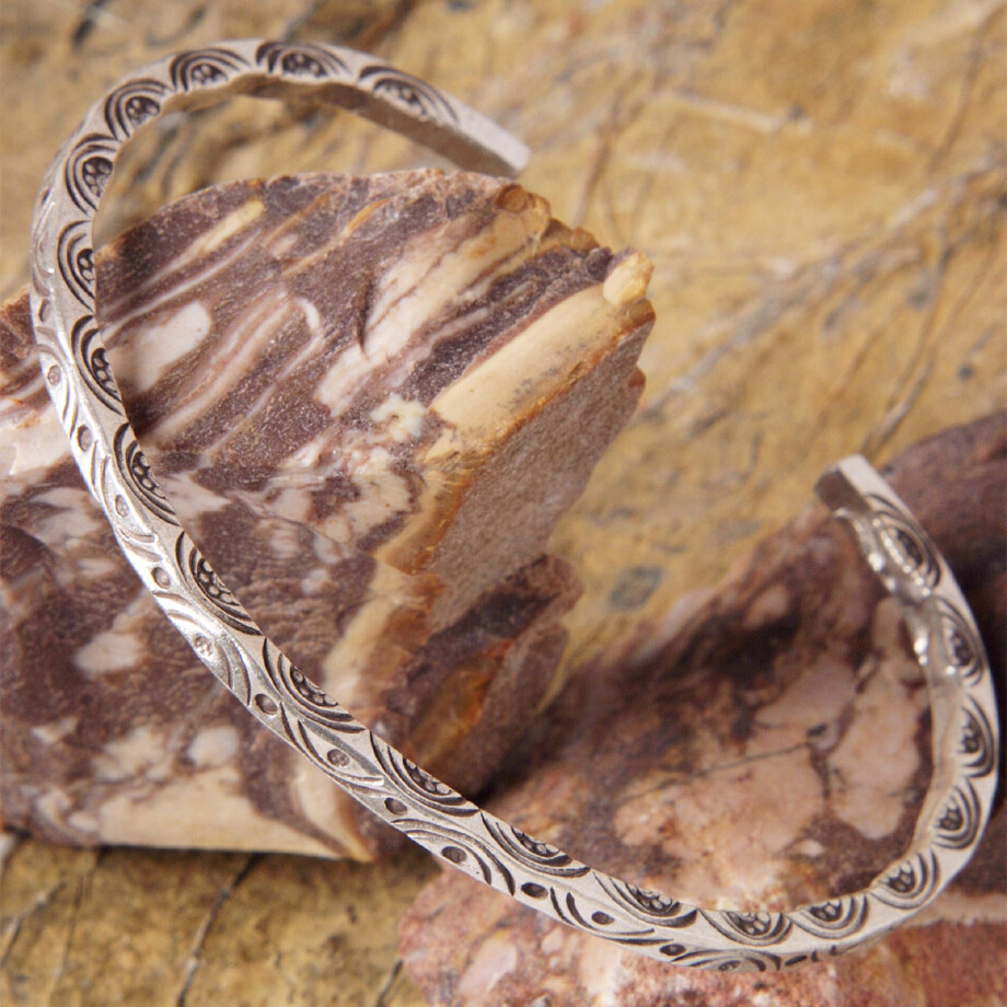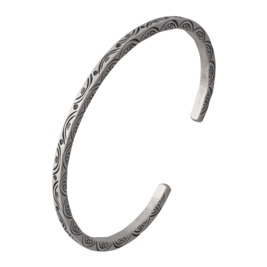 三面に刻印を花びらのように表現した、細身で角棒のカレンシルバーバングルです。