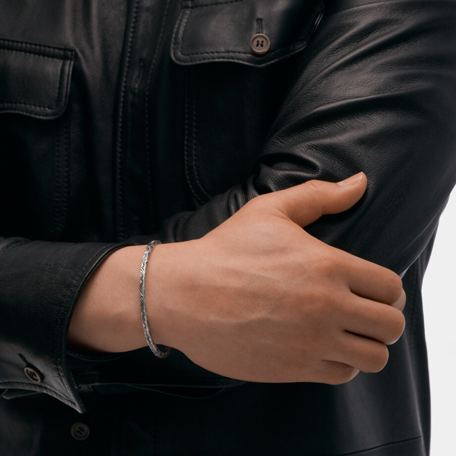 シルバーのバングルでどれが良いかなと悩み、これを購入させていただきました。写真を見たときは断面は三角形かなと思ったのですが四角形で、立体感のある、しかし幅が細いため主張しすぎないお洒落なバングルで気に入りました。側面にも刻印されている柄が立体感を際立たせていて、柄の雰囲気が夏にぴったりと思いました。