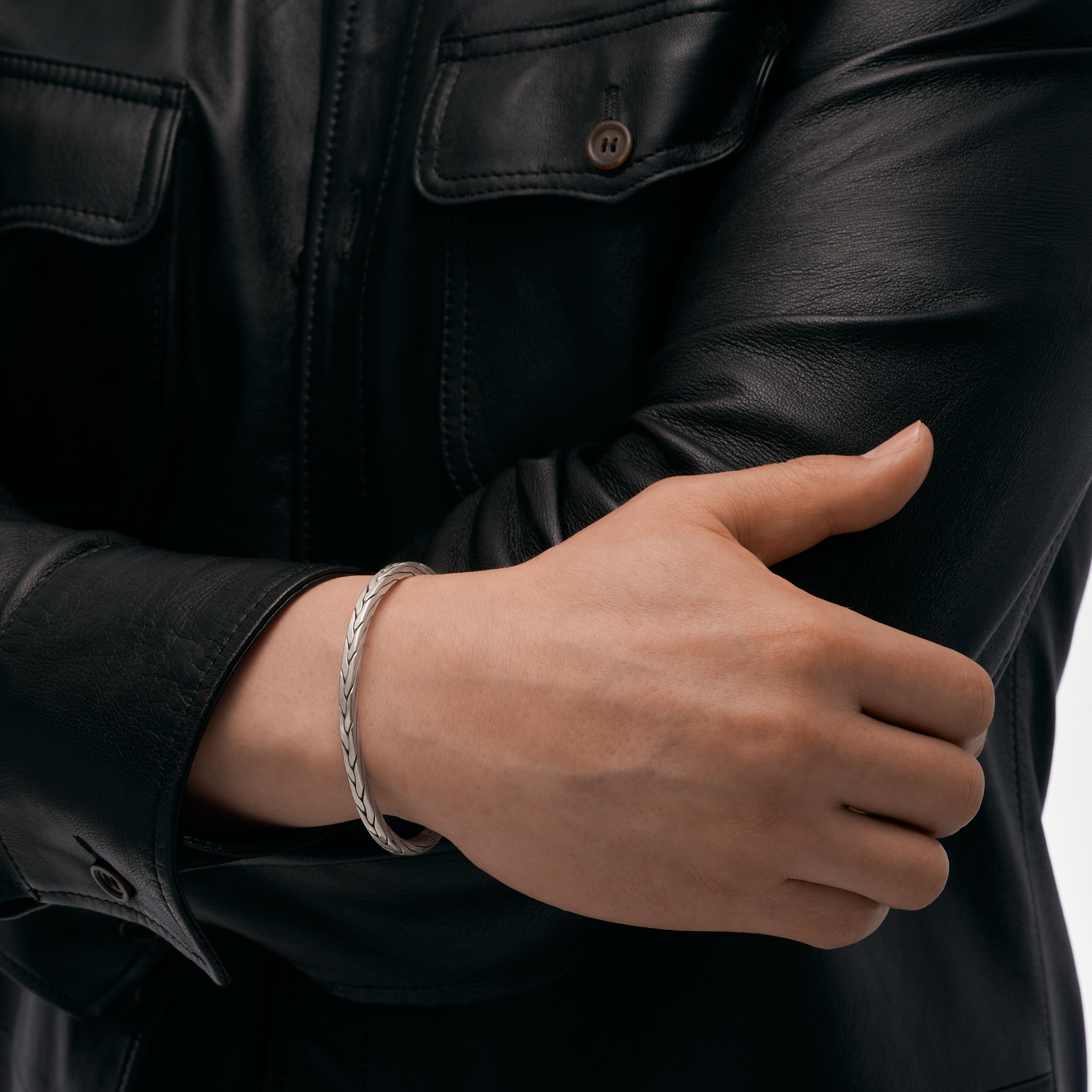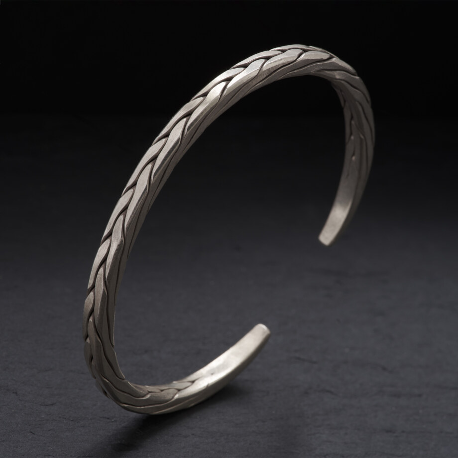 銀の編み目が美しい甲丸のカレンシルバーバングルです。