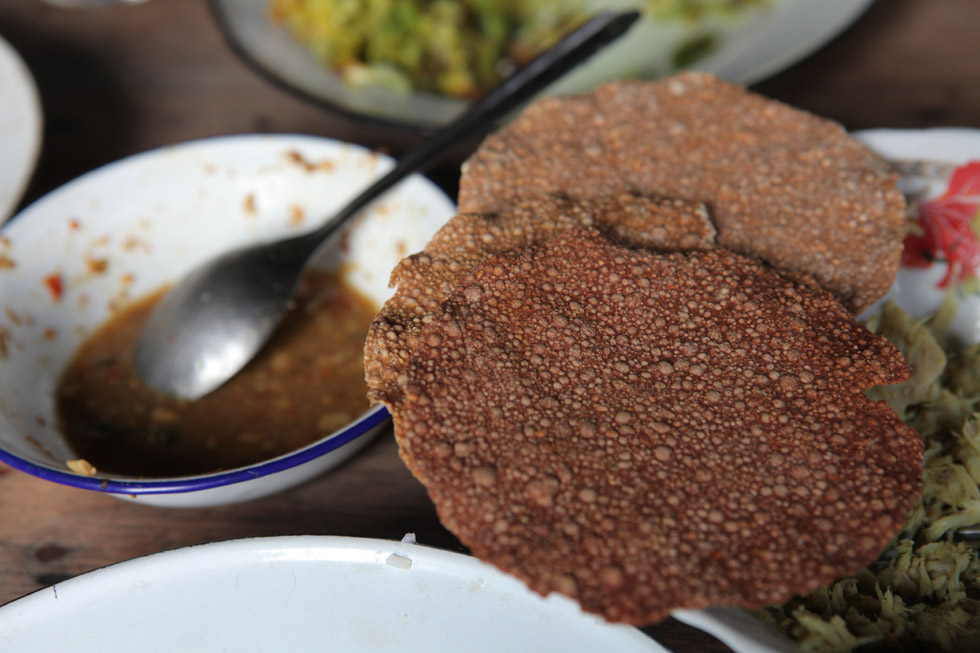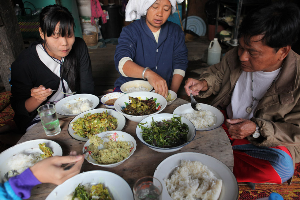 カレン族シルバーの村の朝食。敬虔な仏教徒でベジタリアンのジョディ家ではタイ料理に欠かせないナンプラーさえ使いません。ナンプラーは魚から作られる醤油だからです。