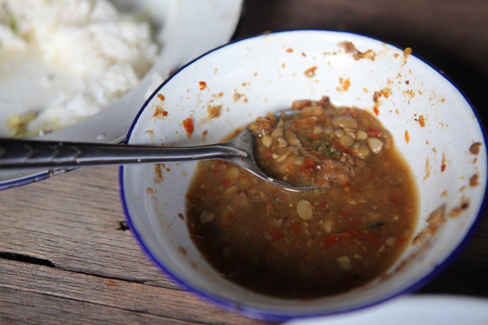 納豆に唐辛子、にんにく、塩を入れて味付けします。味はタイ料理のえびを発酵させた料理「ガピ」にそっくりで納豆の味はあまり感じられません。