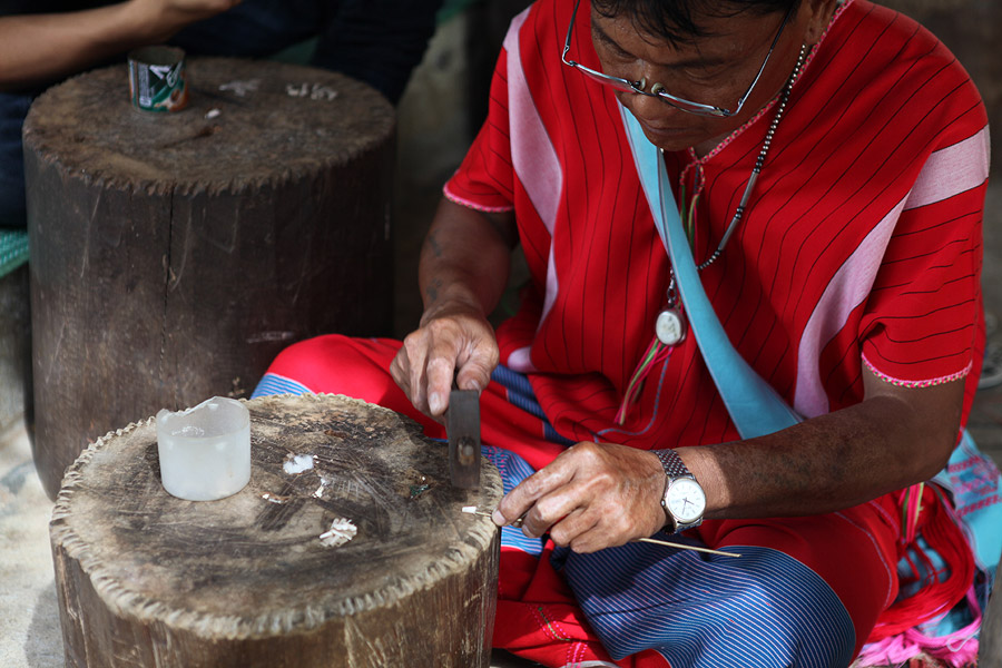 銀板を金槌で叩き槌目模様を付けるカレン族シルバーの職人