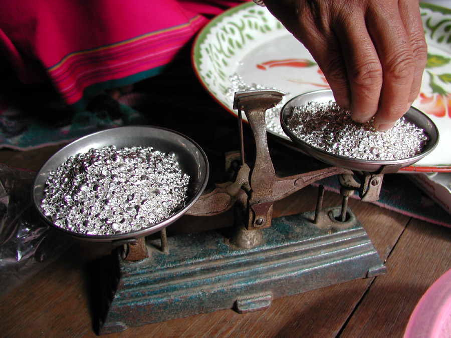 チェンマイで銀を購入し、カレン族シルバーを製作、チェンマイの各店へ持ち込んで買い取ってもらっていたのですが、現在は銀購入は損失が大きくなるので止めました。今は店(チェンマイのカレン族シルバー店)から銀を預り、オーダーされたものを製作しています。」