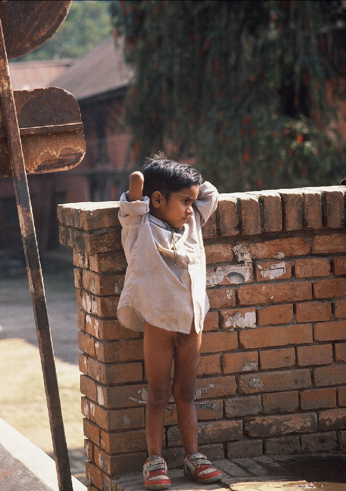 カトマンドゥの路上で、物憂げな横顔を見せる少年。哲学者のような難しい顔をしているが、何か大切なものを穿き忘れていやしませんか。