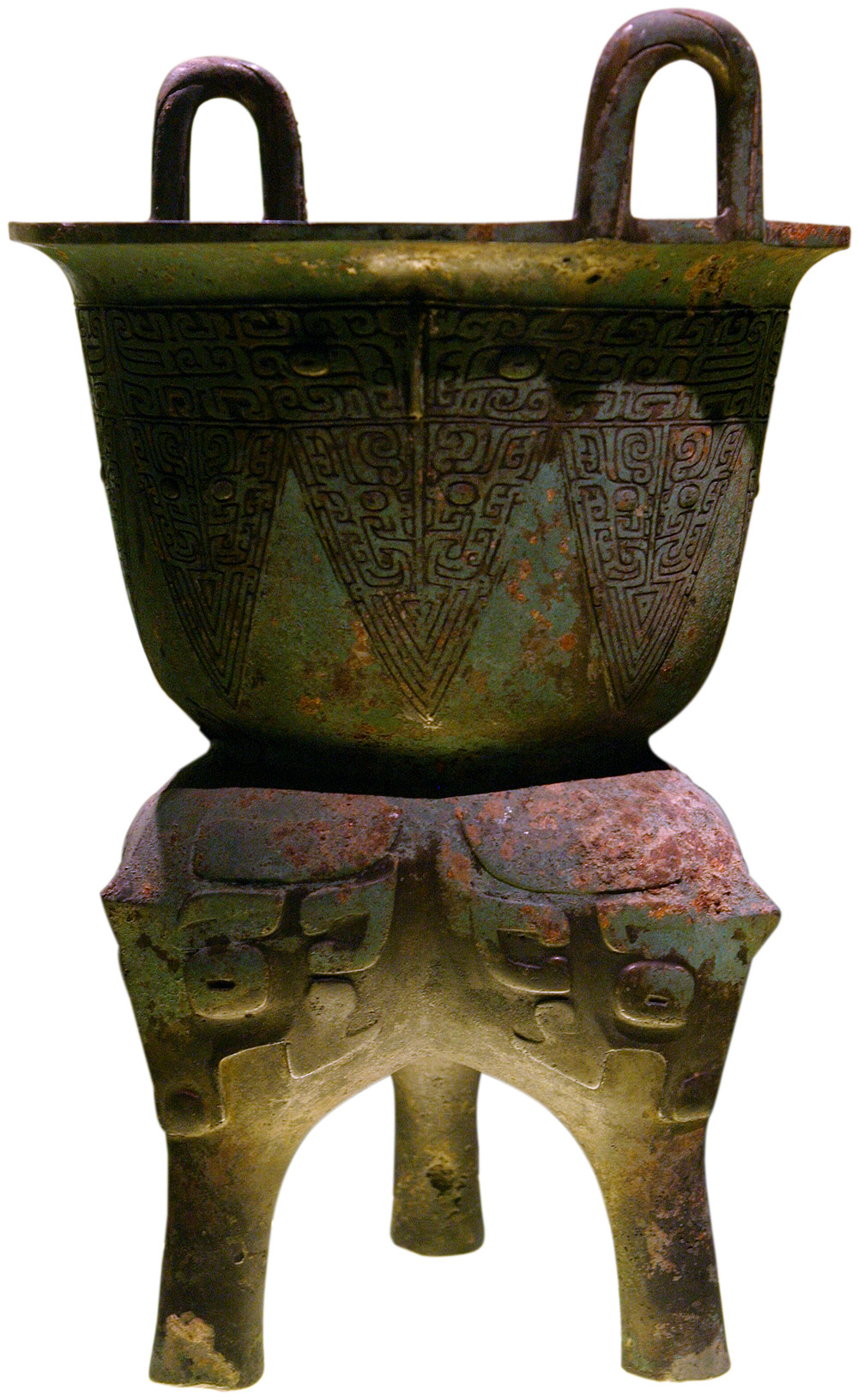 饕餮文(獣面文)、雷文/渦文で装飾された殷代後期の鼎形祭礼用青銅酒器
