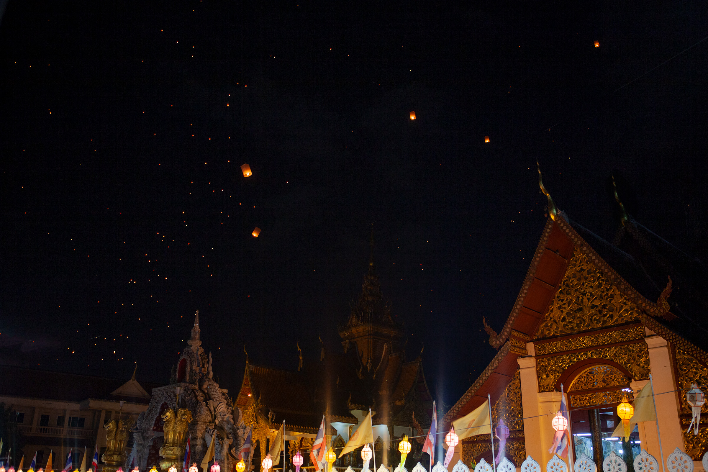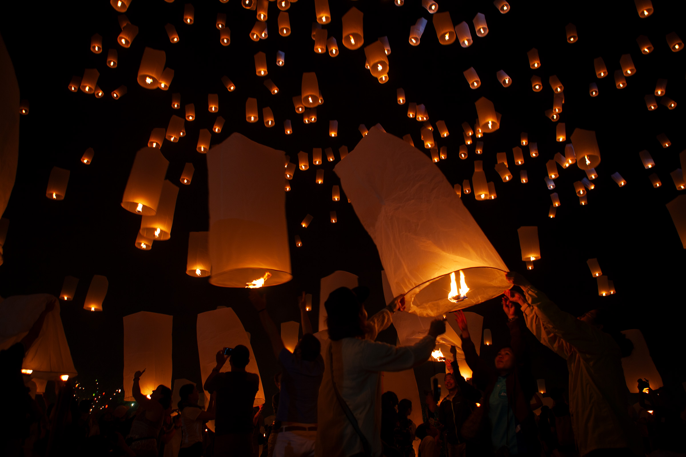 「今日は灯篭流しのお祭りだ。チェンマイでは灯篭を川にも流すが空にも流すんだ」