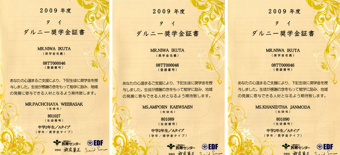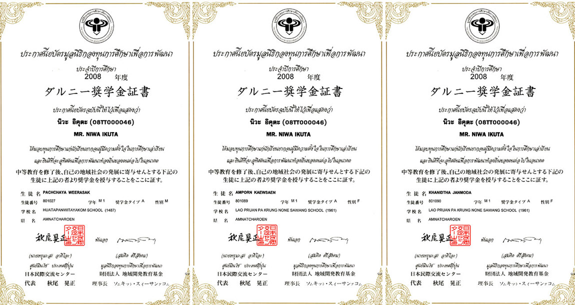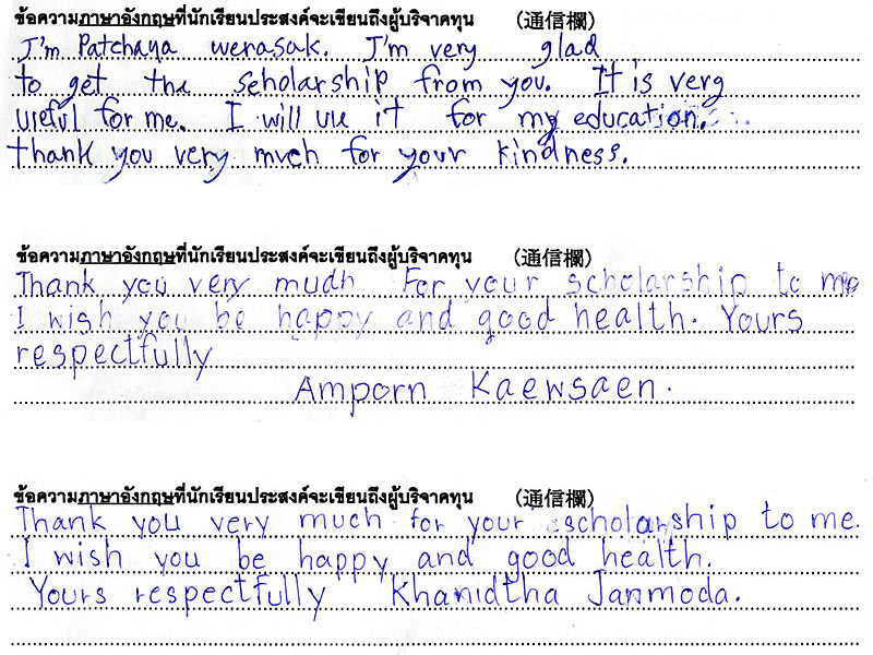 奨学金ありがとうございました。あなた様の幸せと健康を心より祈ります。敬具 アムポーン ゲーウセーン