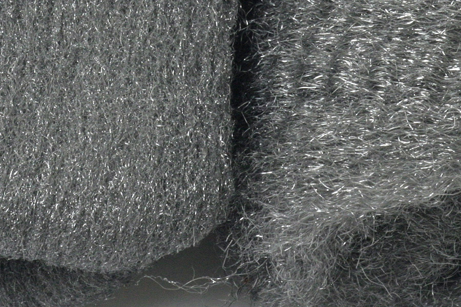 右は一般にスーパーなどで売られているもので、中央のものはそれよりも目の細かいスチールウールです。拡大すると違いがわかります。